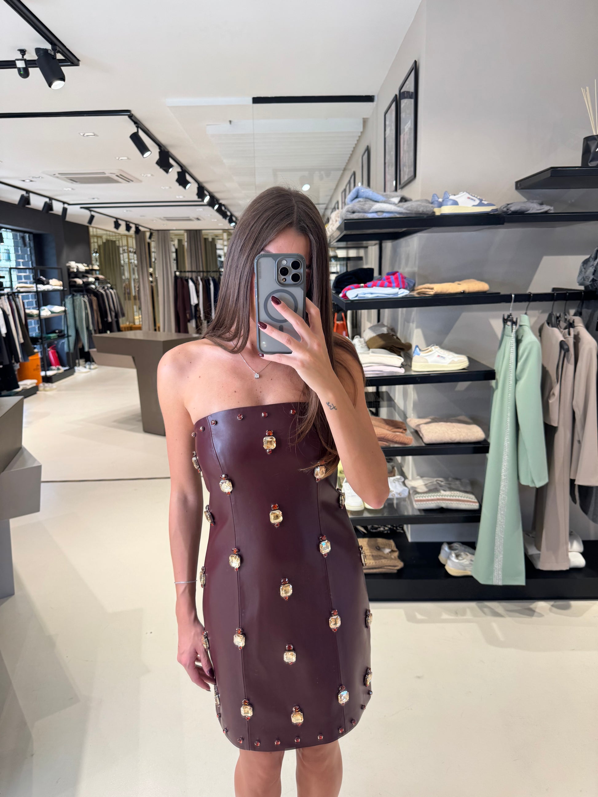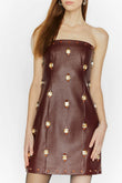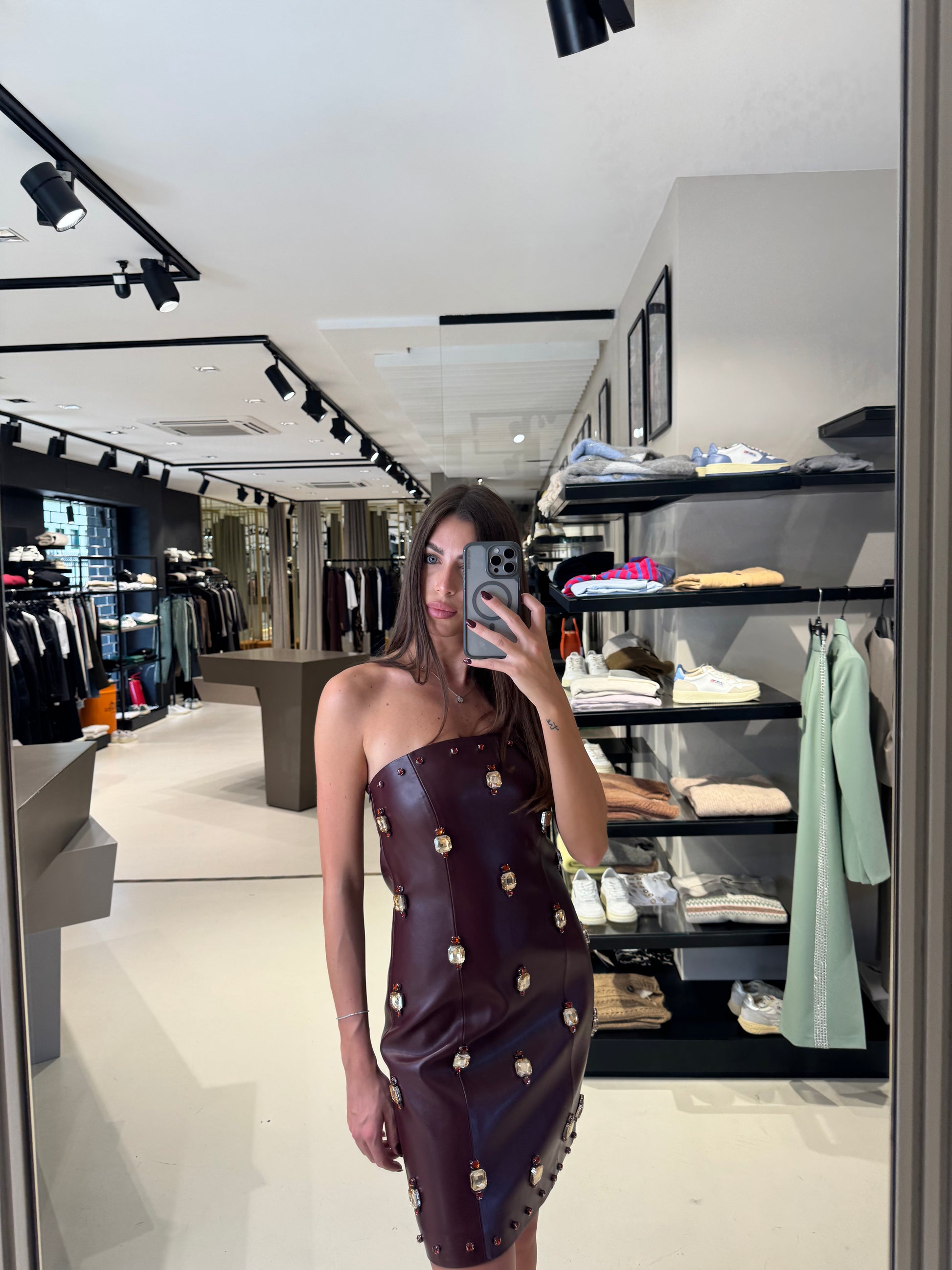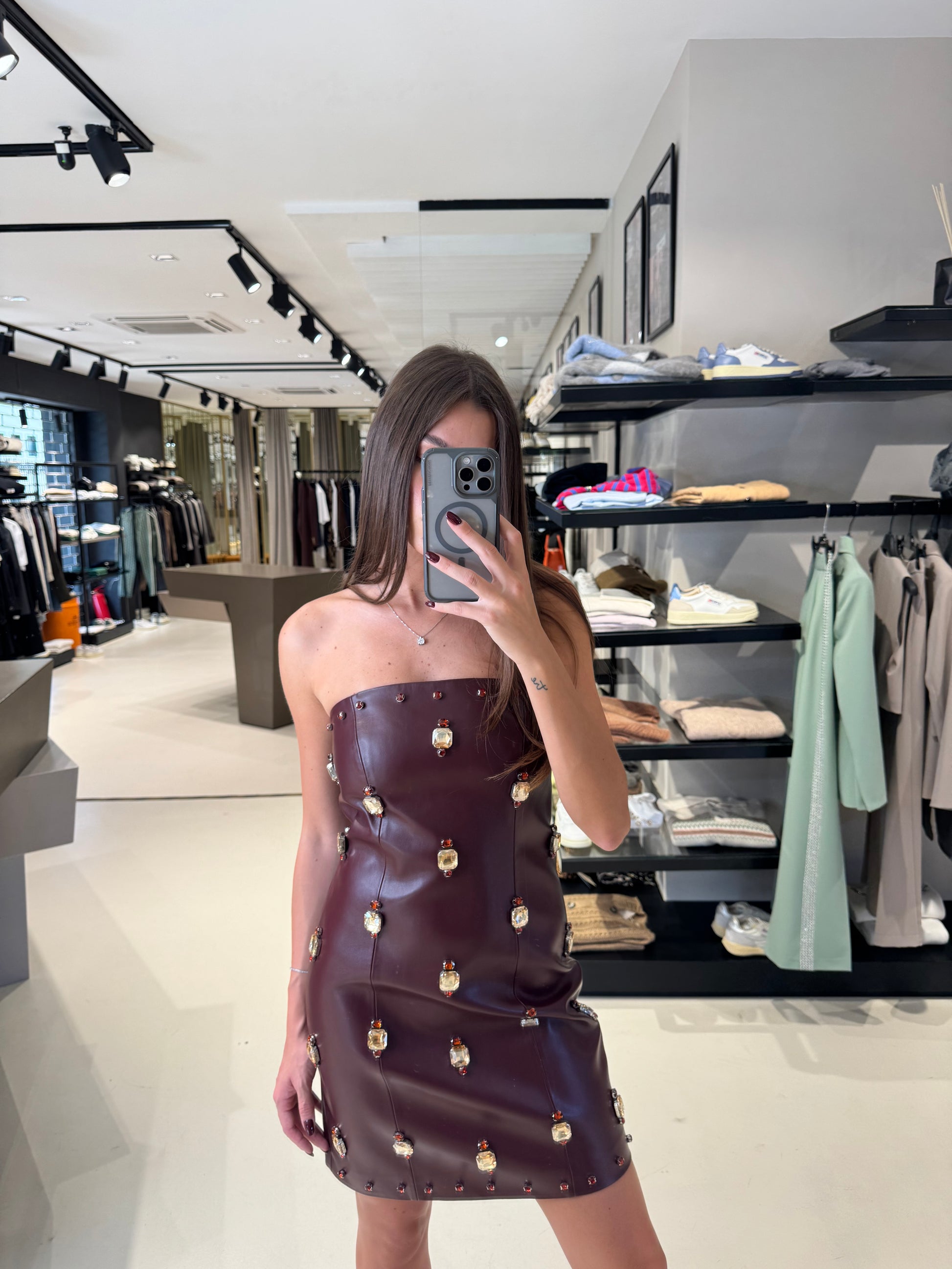 ABITO BUSTIER IN ECOPELLE CON RICAMI IN PIETRA.