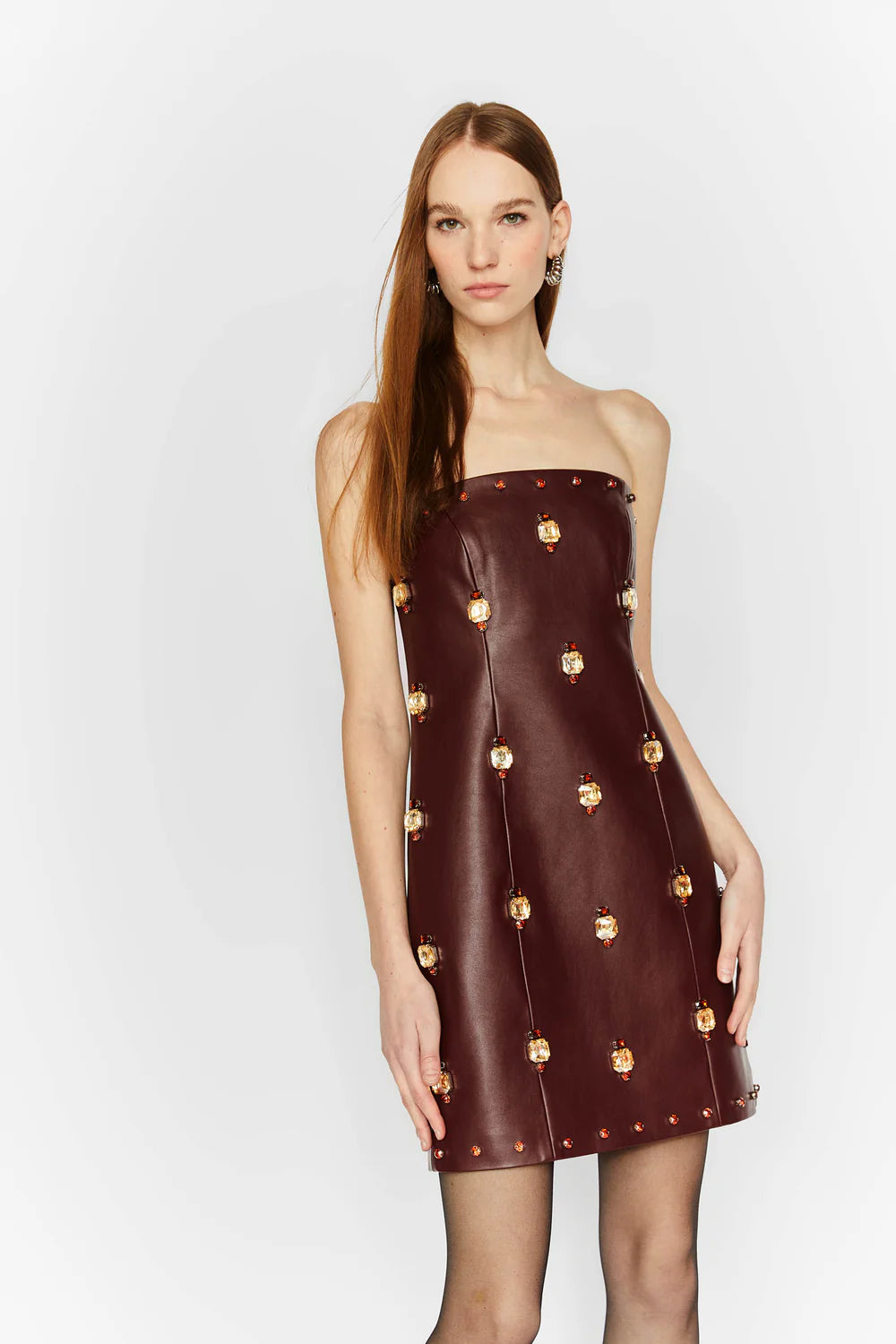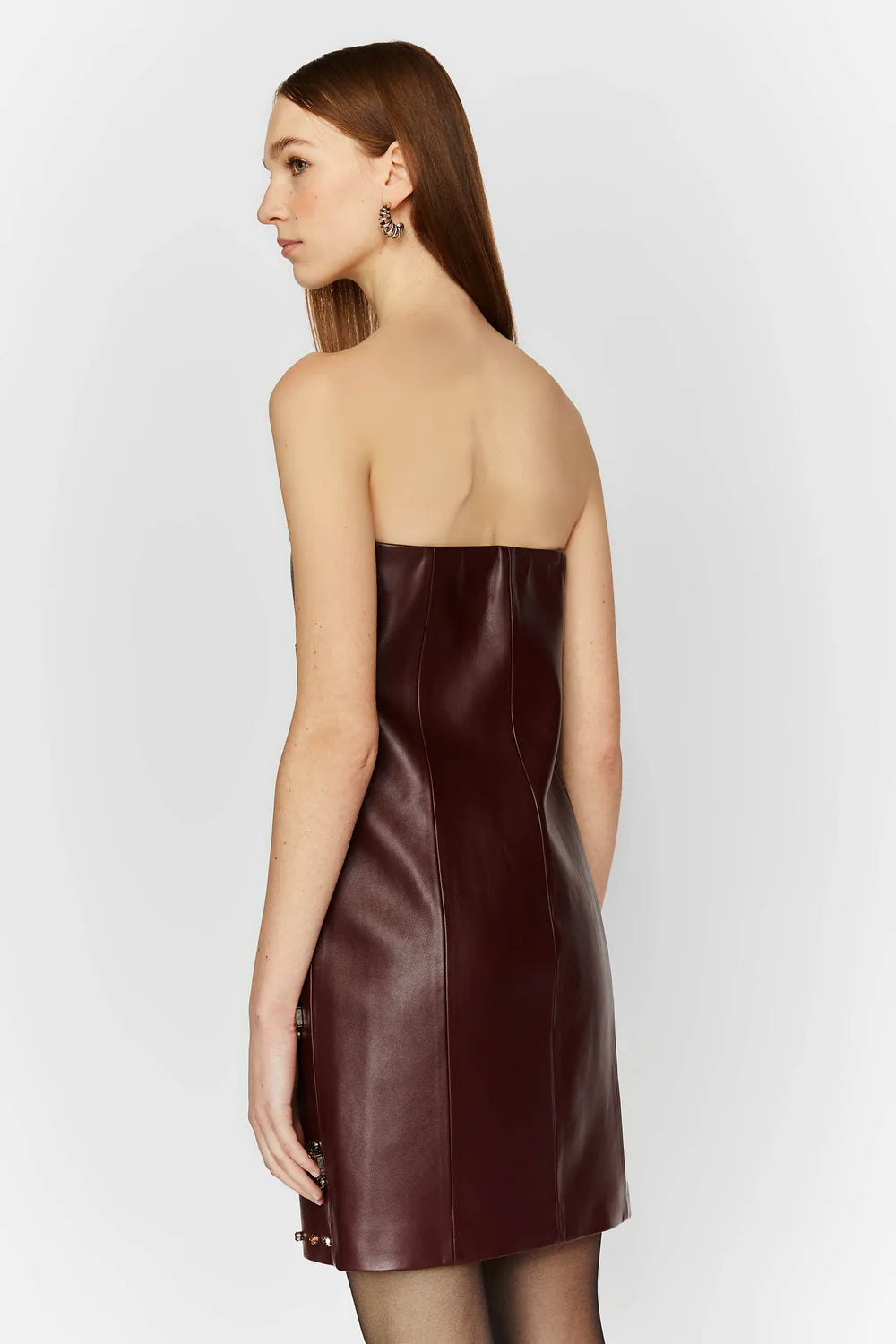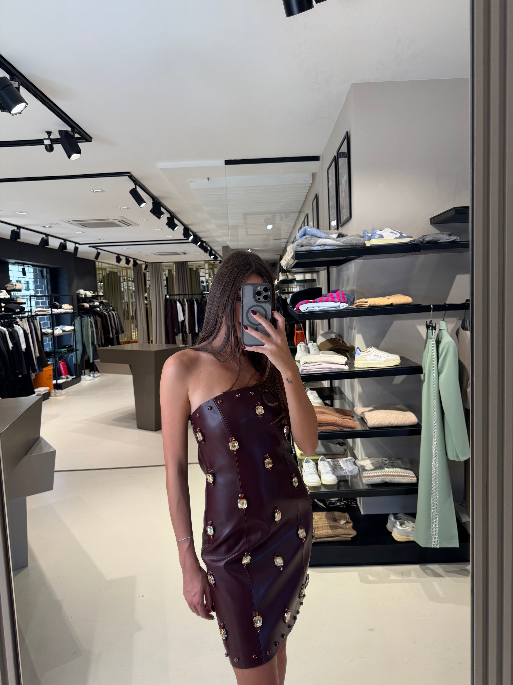 ABITO BUSTIER IN ECOPELLE CON RICAMI IN PIETRA.
