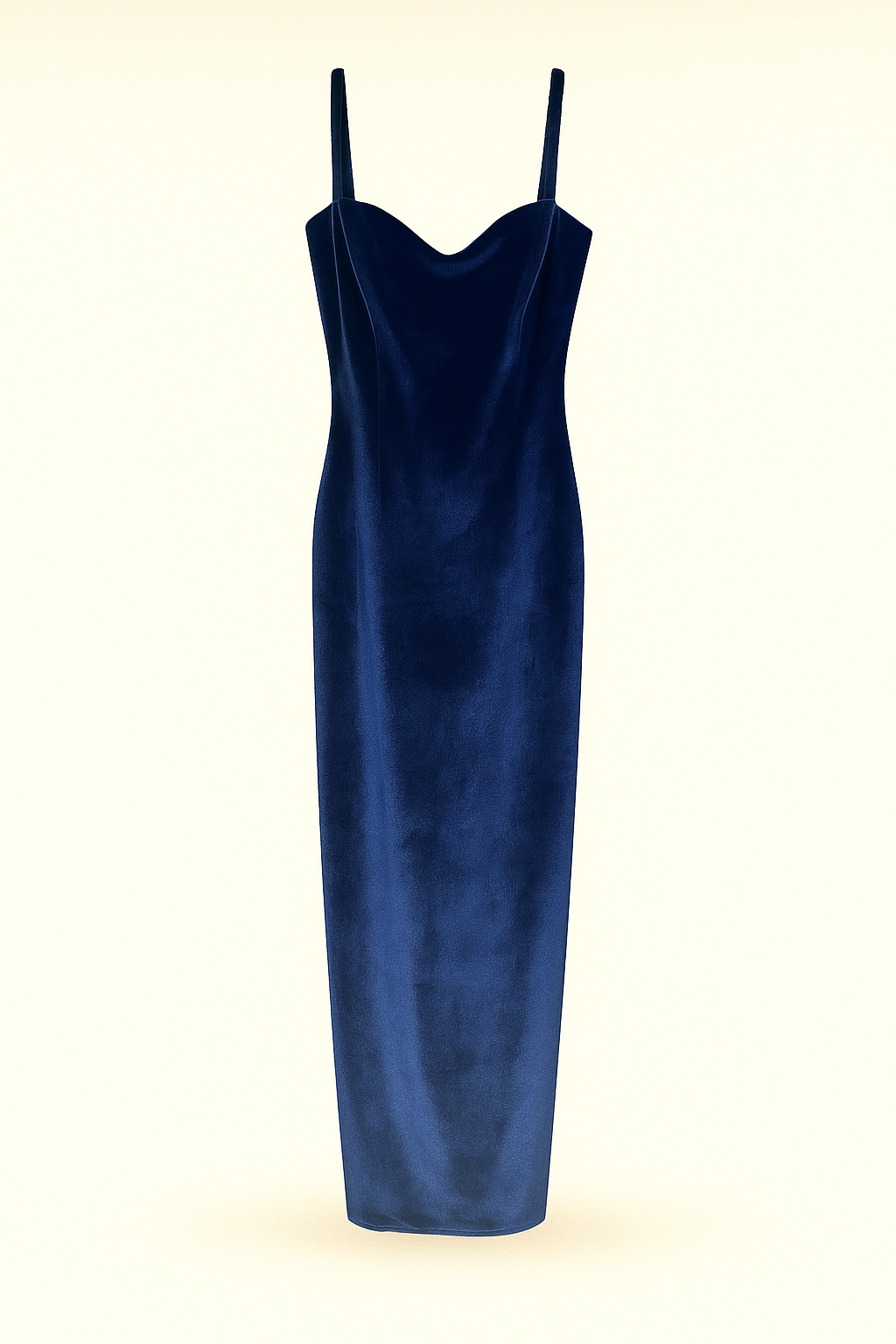 Abito lungo con spalline sottili in morbido velluto stretch, dalla linea scivolata e femminile. Il tessuto luminoso e il taglio minimal lo rendono perfetto per serate ed eventi eleganti.