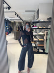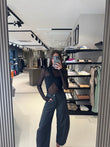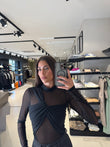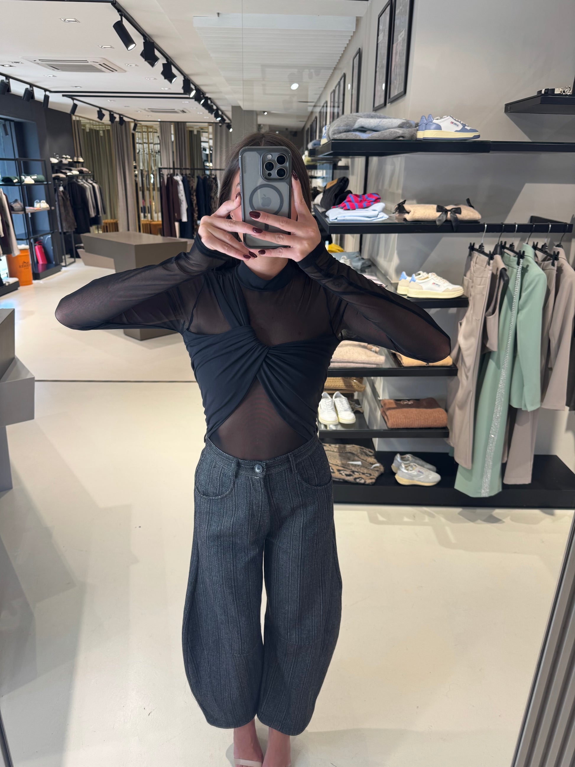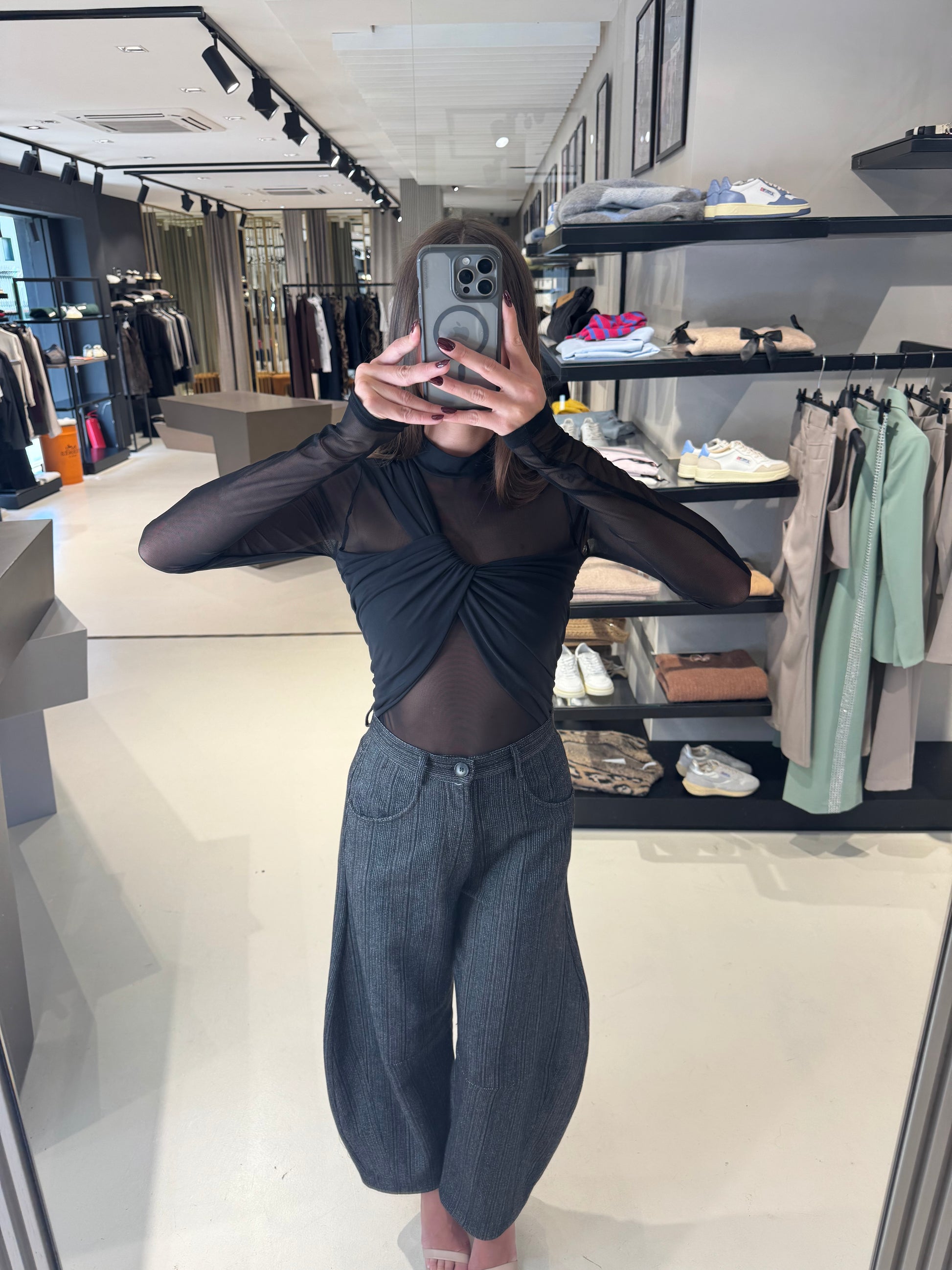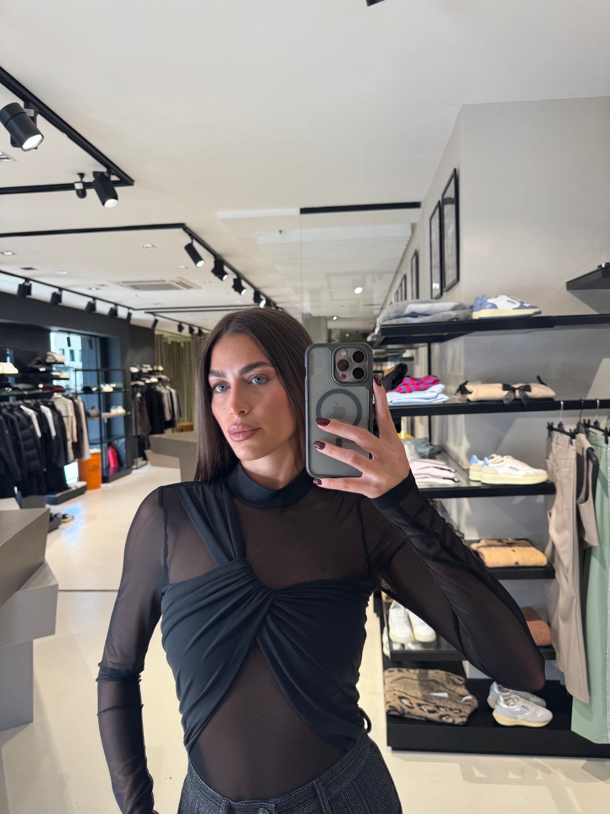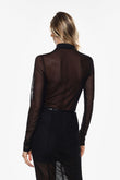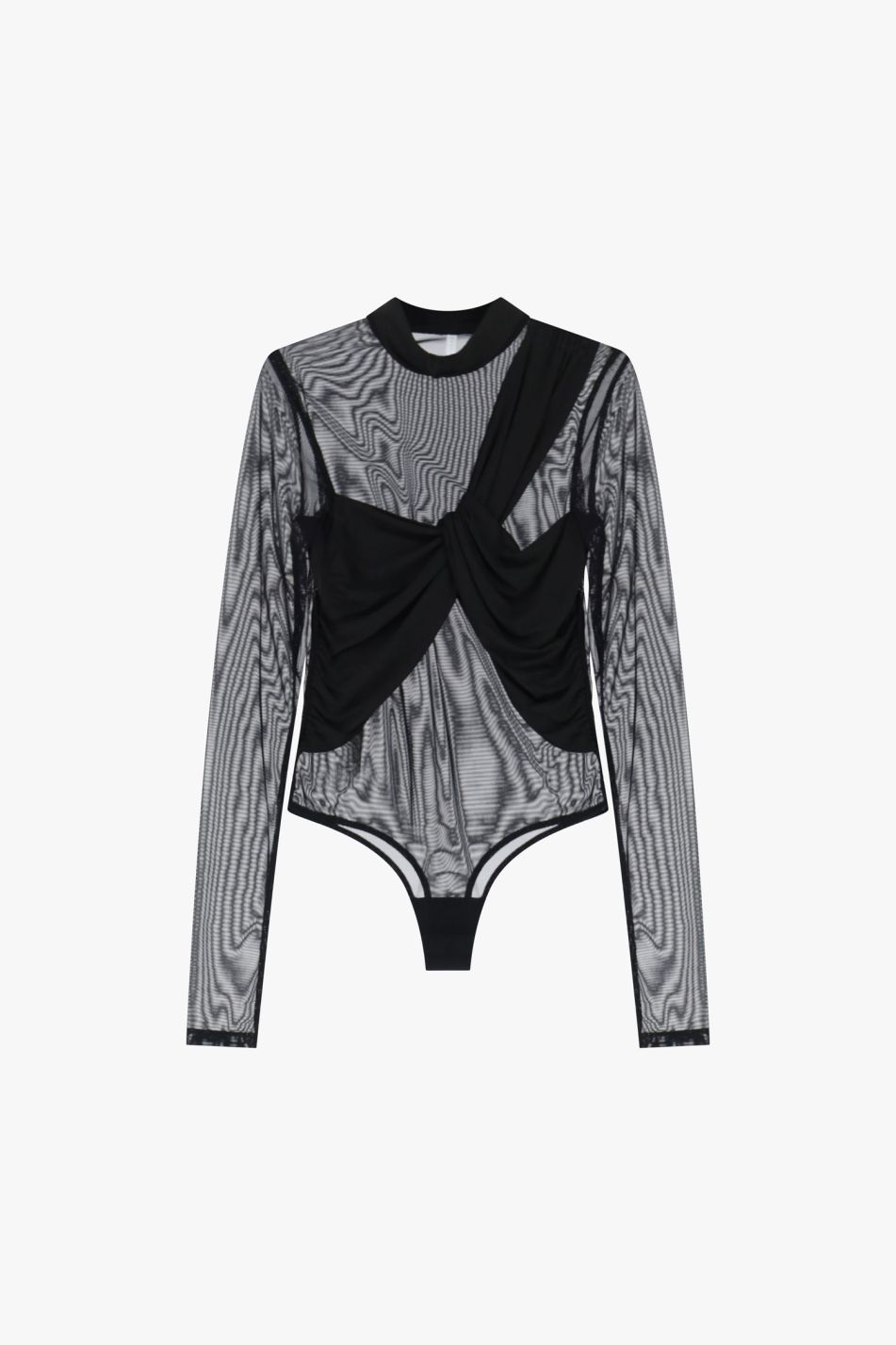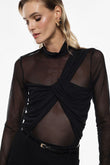 Body in tulle nero trasparente con drappeggio incrociato frontale. Modello a maniche lunghe con chiusura inferiore a pressione. Effetto vedo-non-vedo elegante e sensuale, ideale sotto blazer o capi sartoriali.