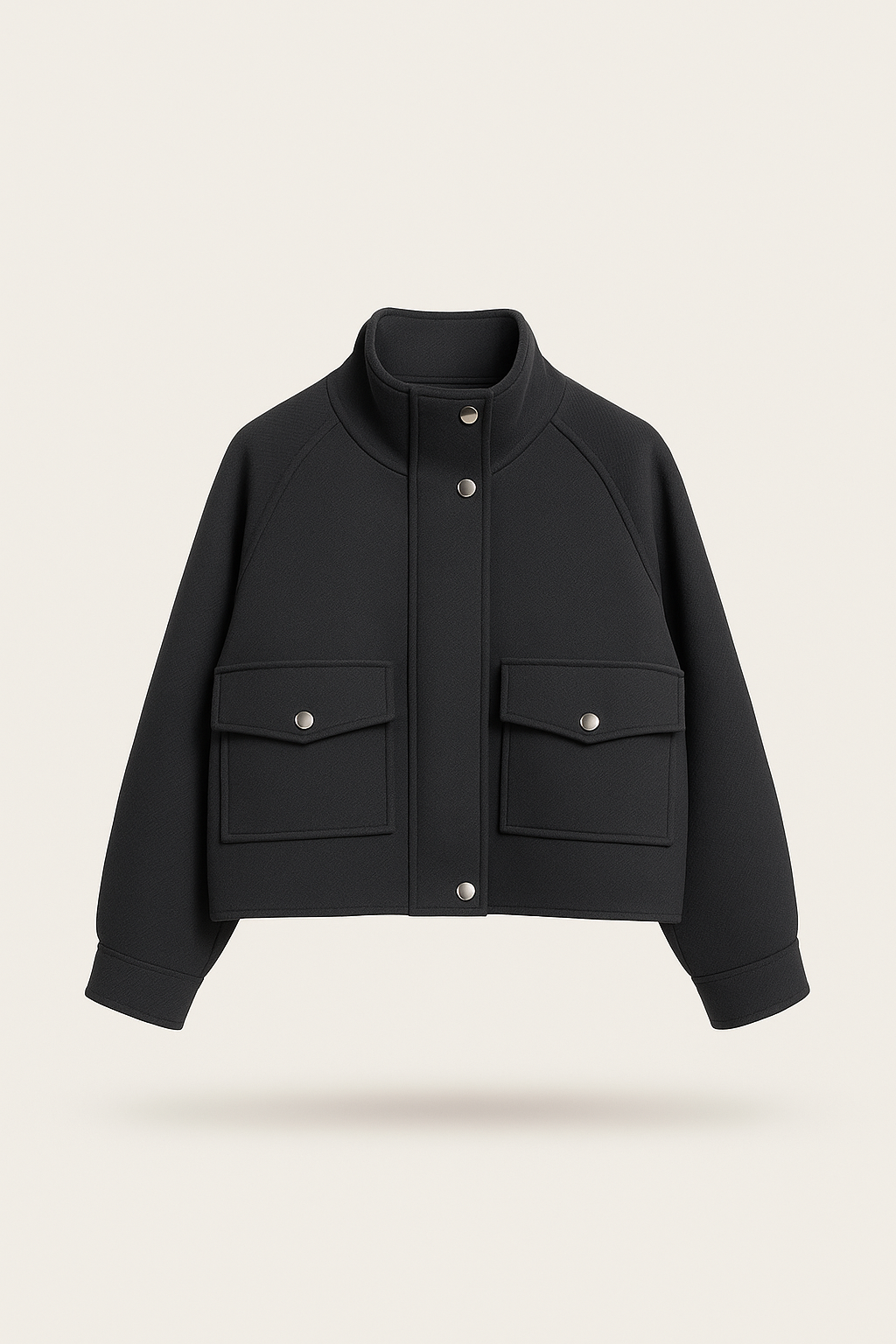 Giacca corta in tessuto strutturato con chiusura a bottoni automatici. Design moderno con ampie tasche frontali e collo alto per un look urbano e raffinato.
