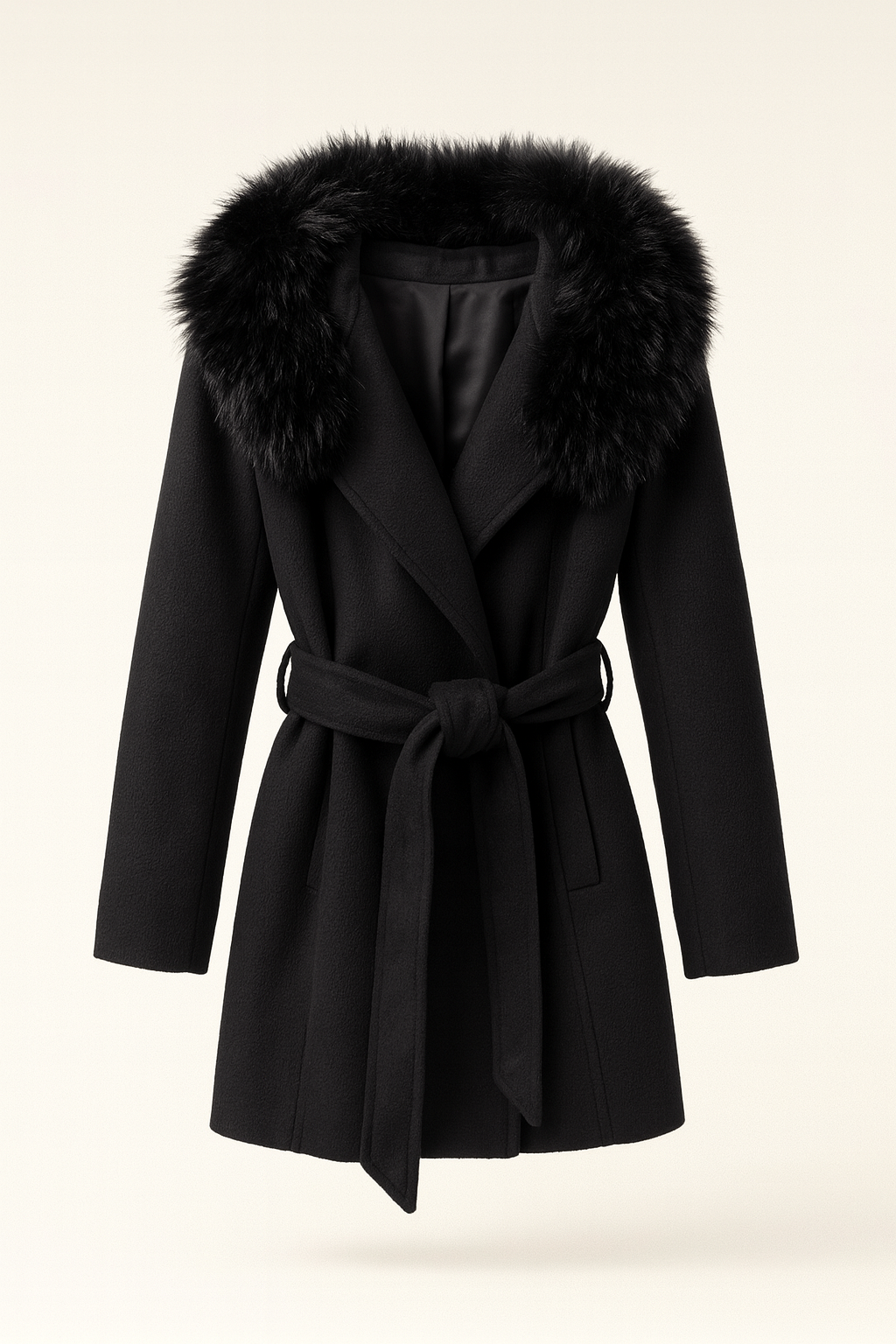 Cappotto elegante in tessuto misto lana con cintura in vita e ampio collo in eco-pelliccia rimovibile. Taglio femminile e avvolgente, ideale per valorizzare la silhouette e garantire calore nelle giornate fredde. Foderato internamente per un comfort ottimale.