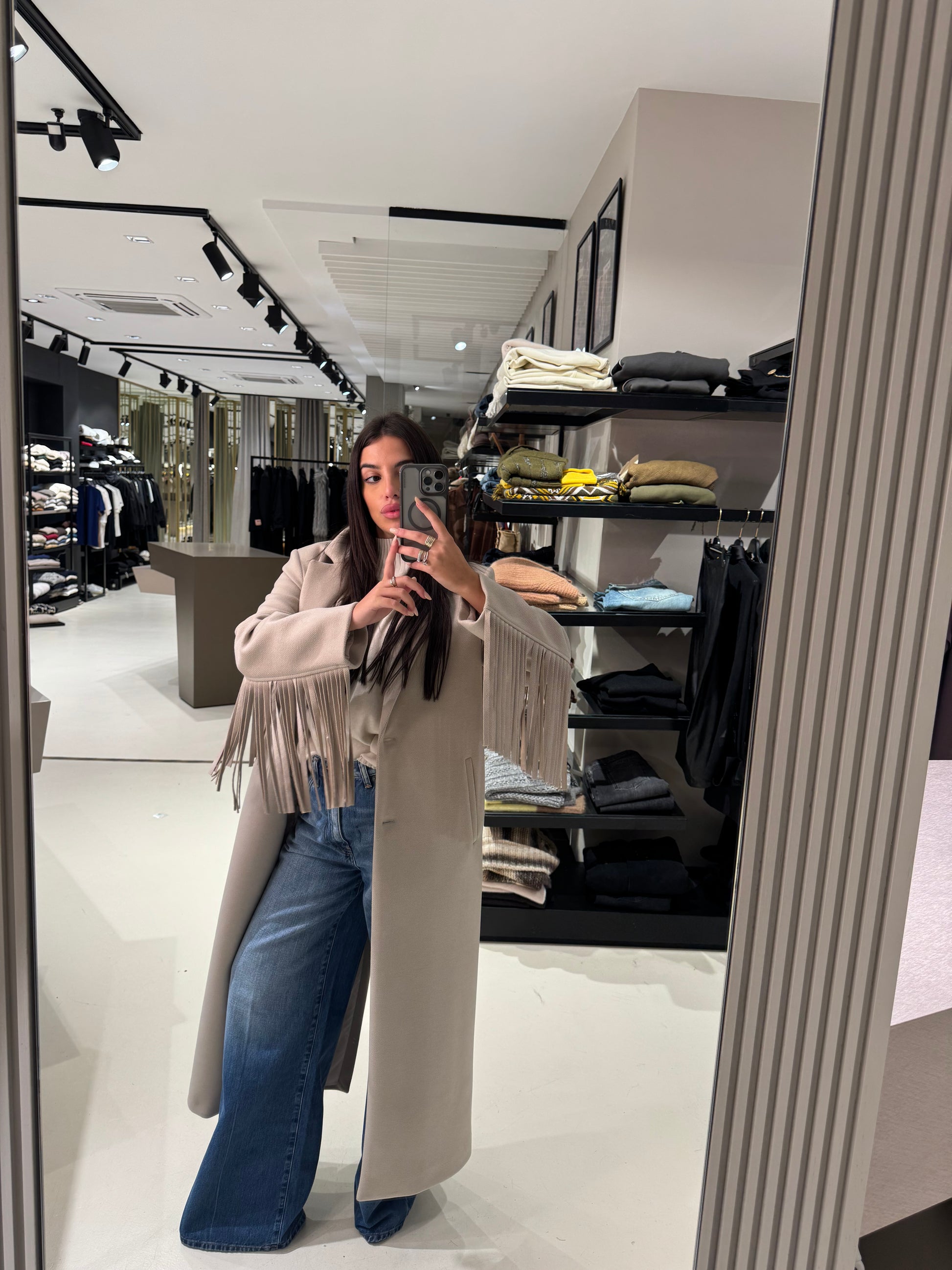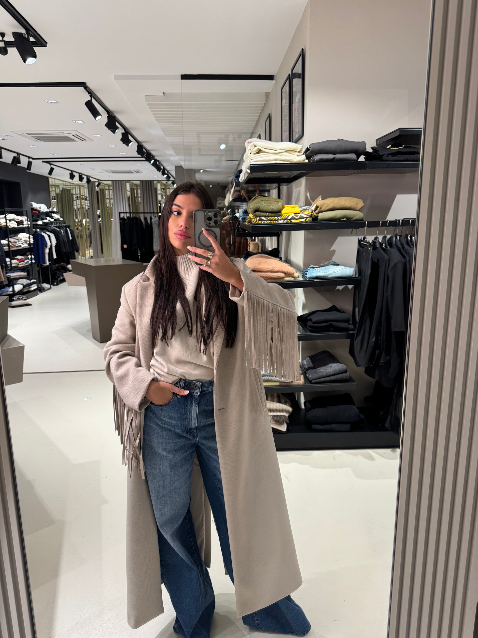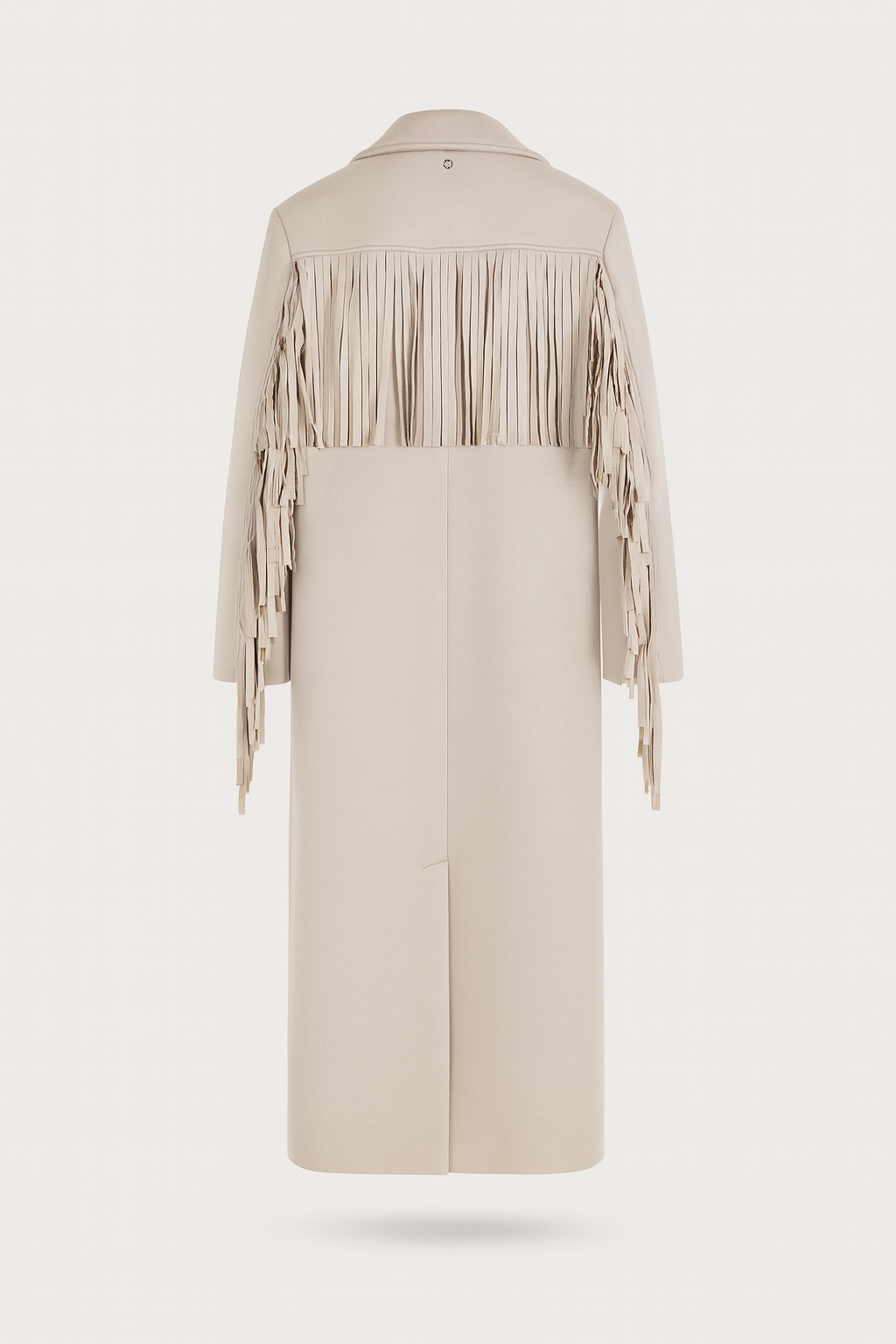 Cappotto lungo dal design contemporaneo con frange decorative sul retro e sulle maniche. Un capo originale e sofisticato, ideale per distinguersi con stile.