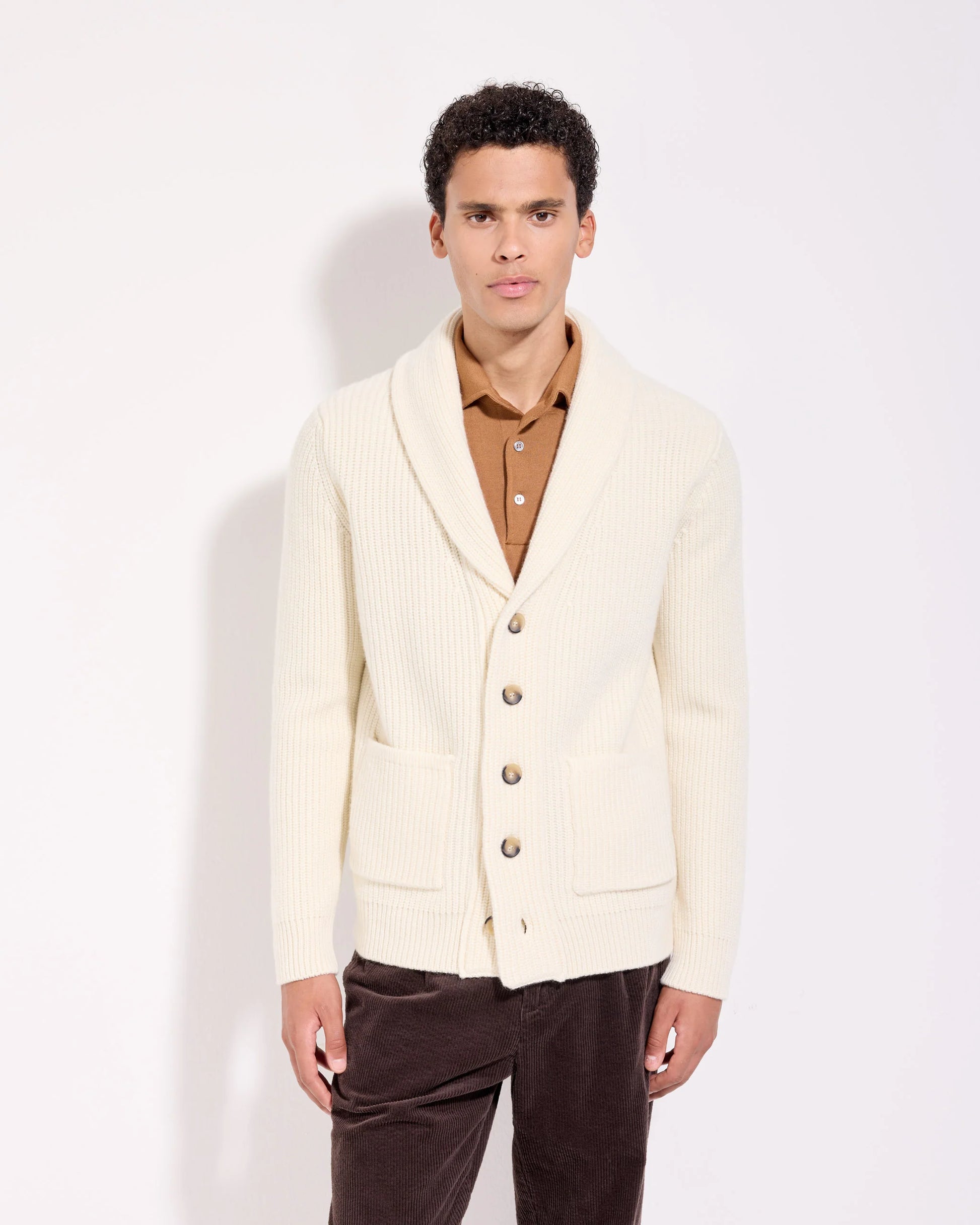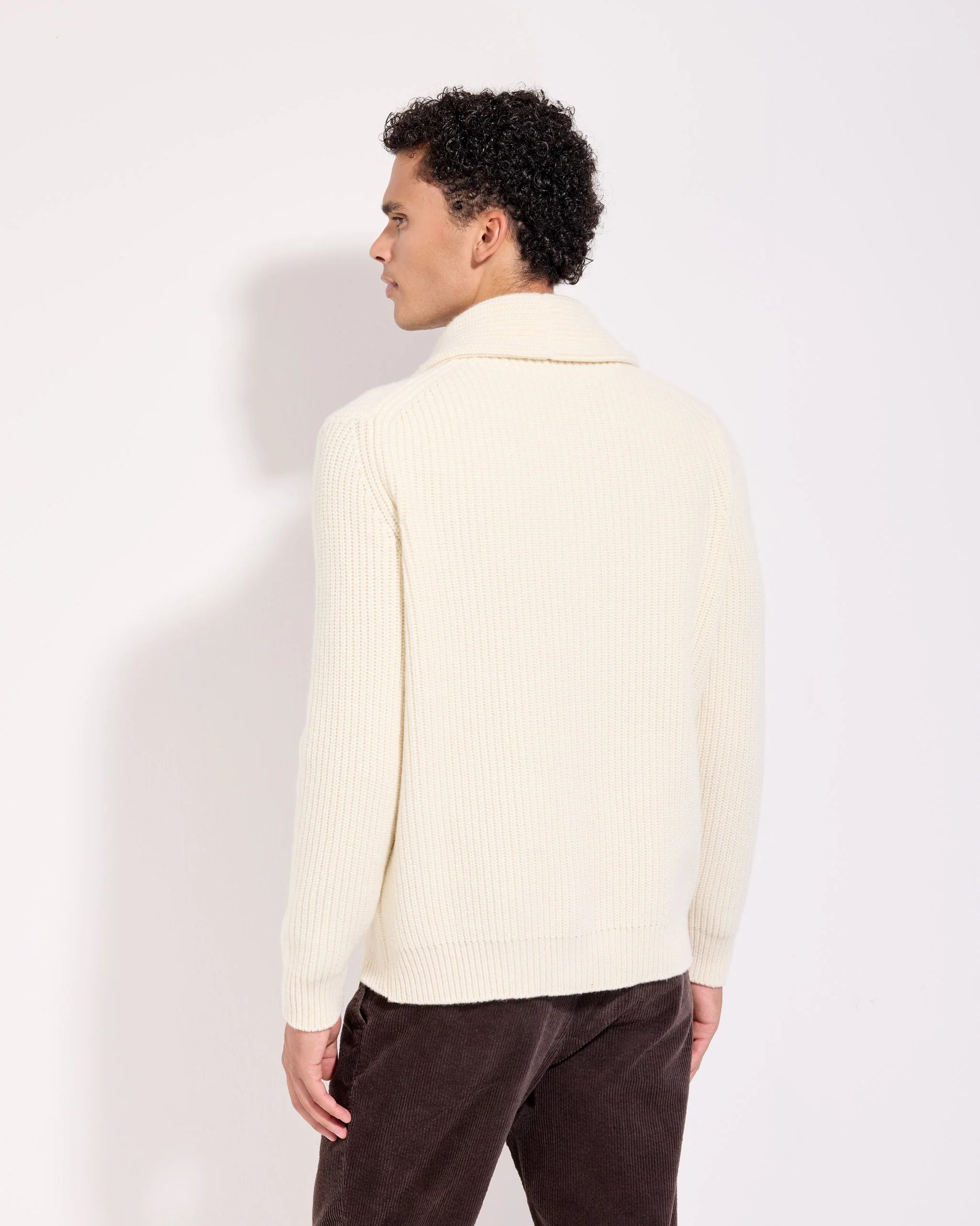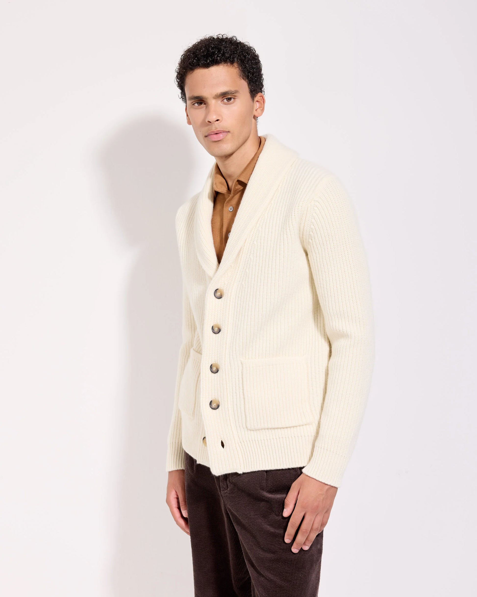 Il cardigan sciallato con tasche è realizzato in lana cashmere, dotato di un collo sciallato che aggiunge un tocco di eleganza. Questo capo ampio è progettato per offrire comfort e praticità, rendendolo ideale per ogni occasione. La sua lavorazione di alta qualità garantisce una vestibilità perfetta e un aspetto curato.