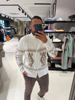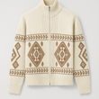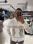 cardigan in maglia pesante color panna con zip intera e motivi geometrici marroni a rombi e greche.