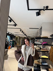 Giacca corta in ecopelle effetto scamosciato con interno in shearling sintetico color panna. Colletto ampio, chiusura frontale con bottone e ricami decorativi sulle maniche. Morbida, calda e dal carattere vintage, è perfetta per i look invernali casual-chic.