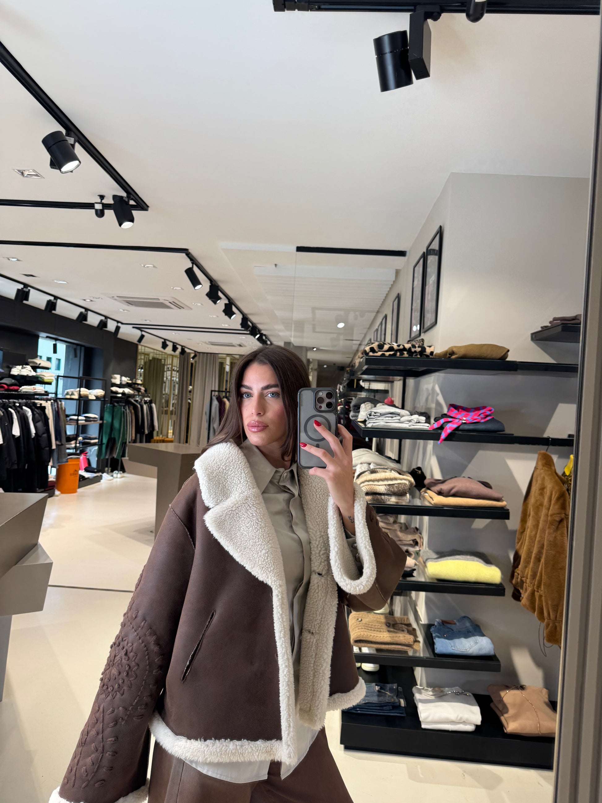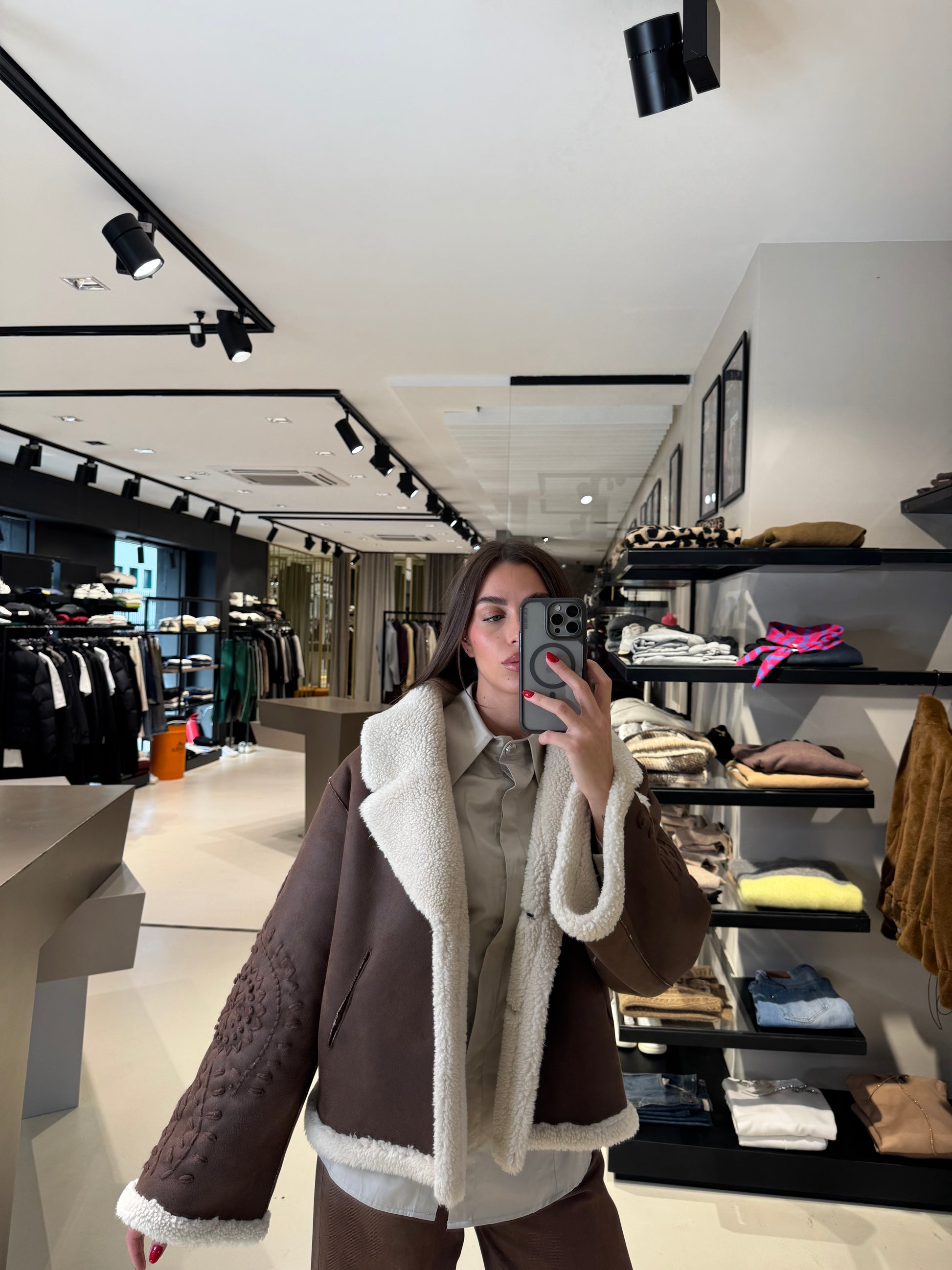 - Dettagli: ricami sulle maniche, colletto ampio, interno in shearling