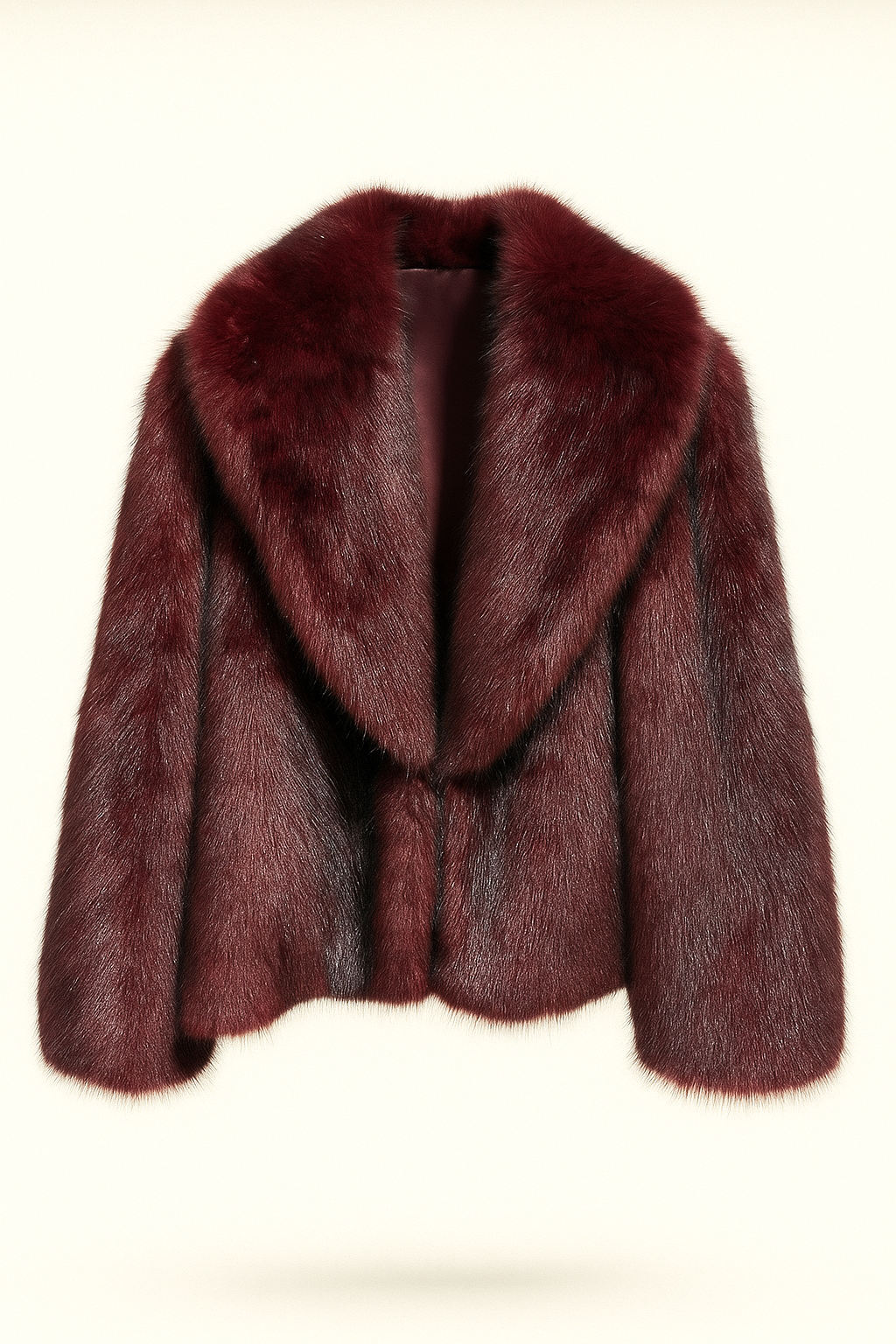 Cappotto corto in pelliccia ecologica bordeaux dal finish lucido, con ampio collo revers e linea leggermente svasata. Un capo elegante e sofisticato, ideale per completare i look da sera e i total black invernali.