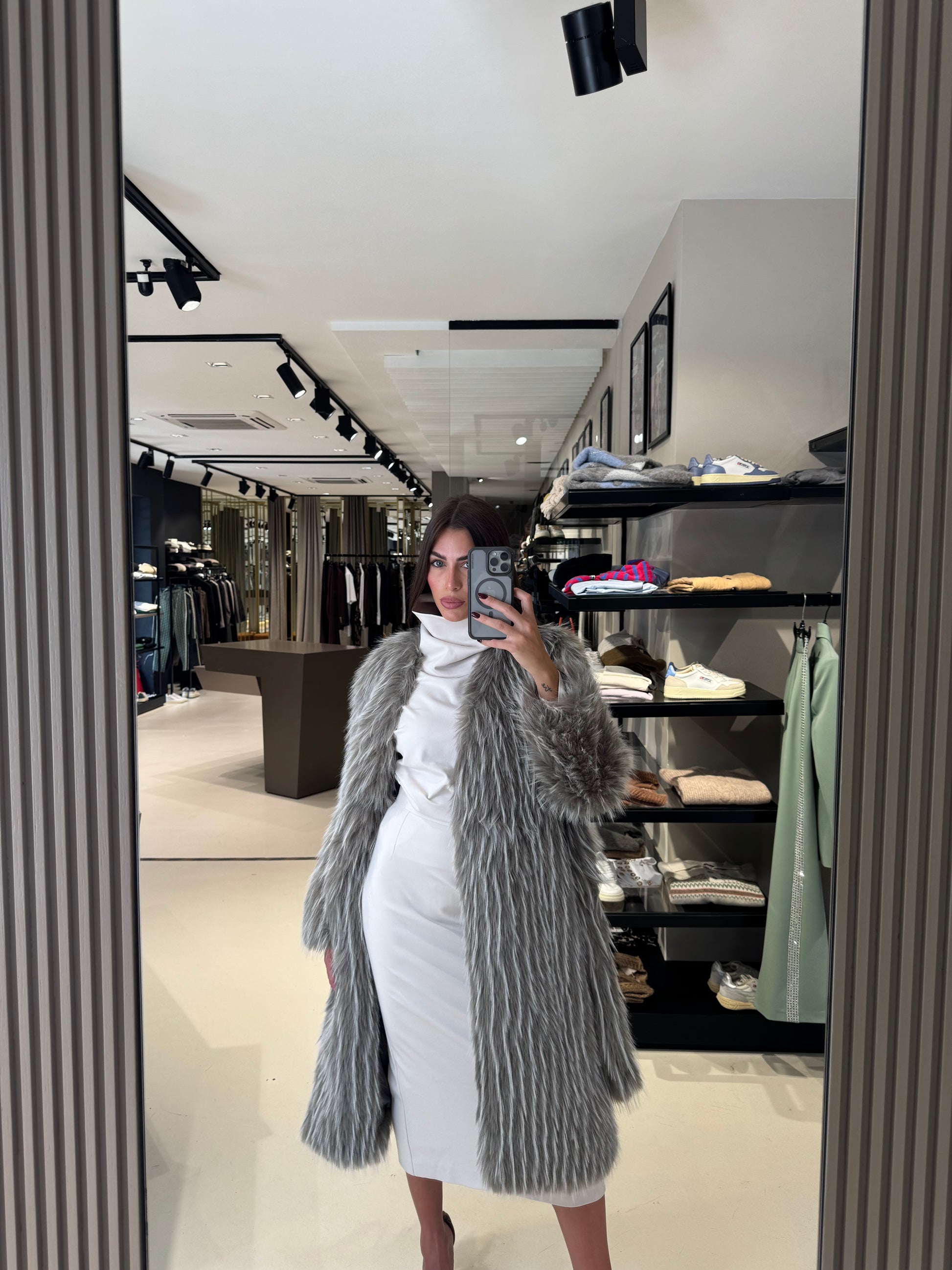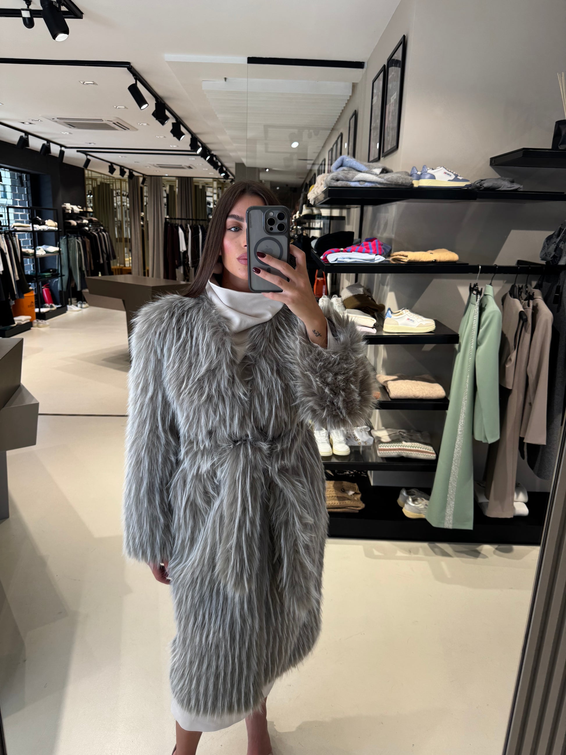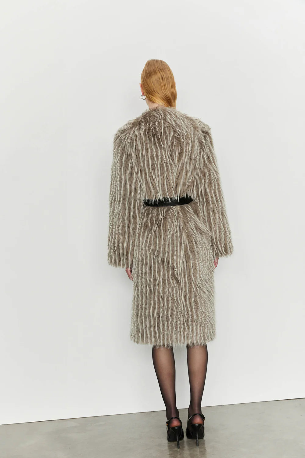 CAPPOTTO IN ECOPELLICCIA SENZA COLLO CON CINTURA.