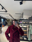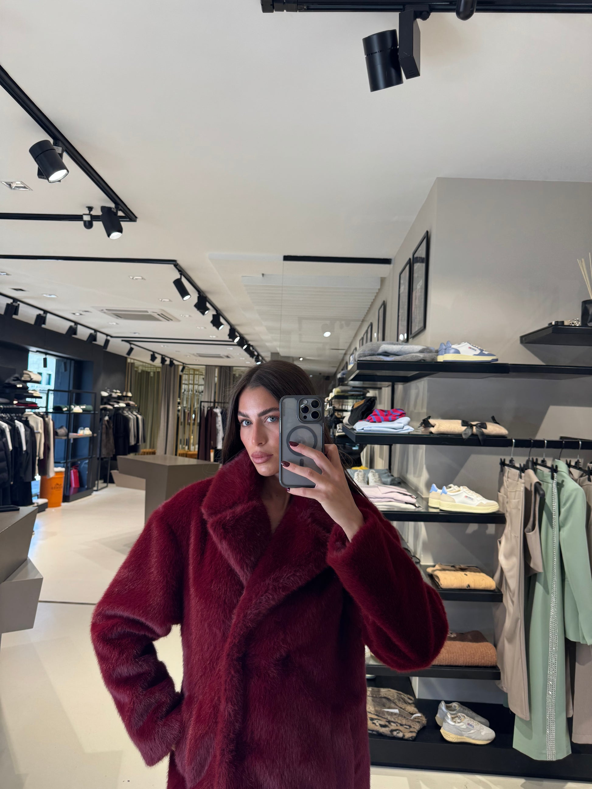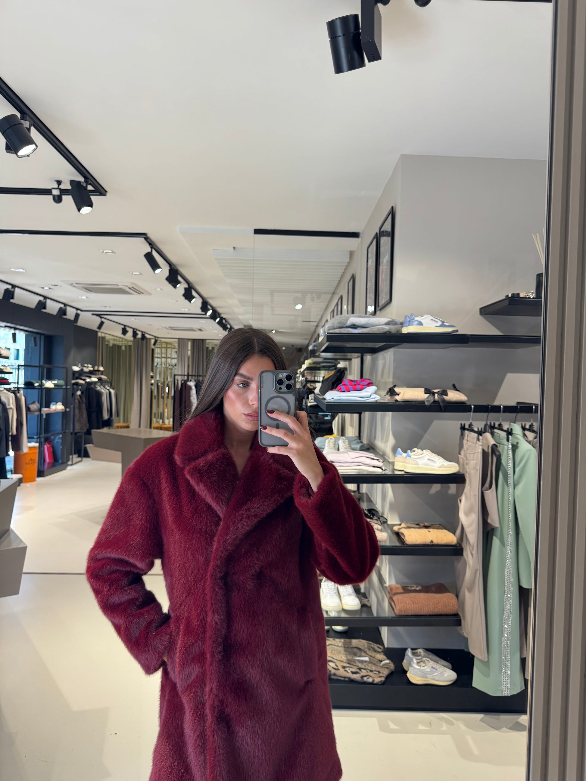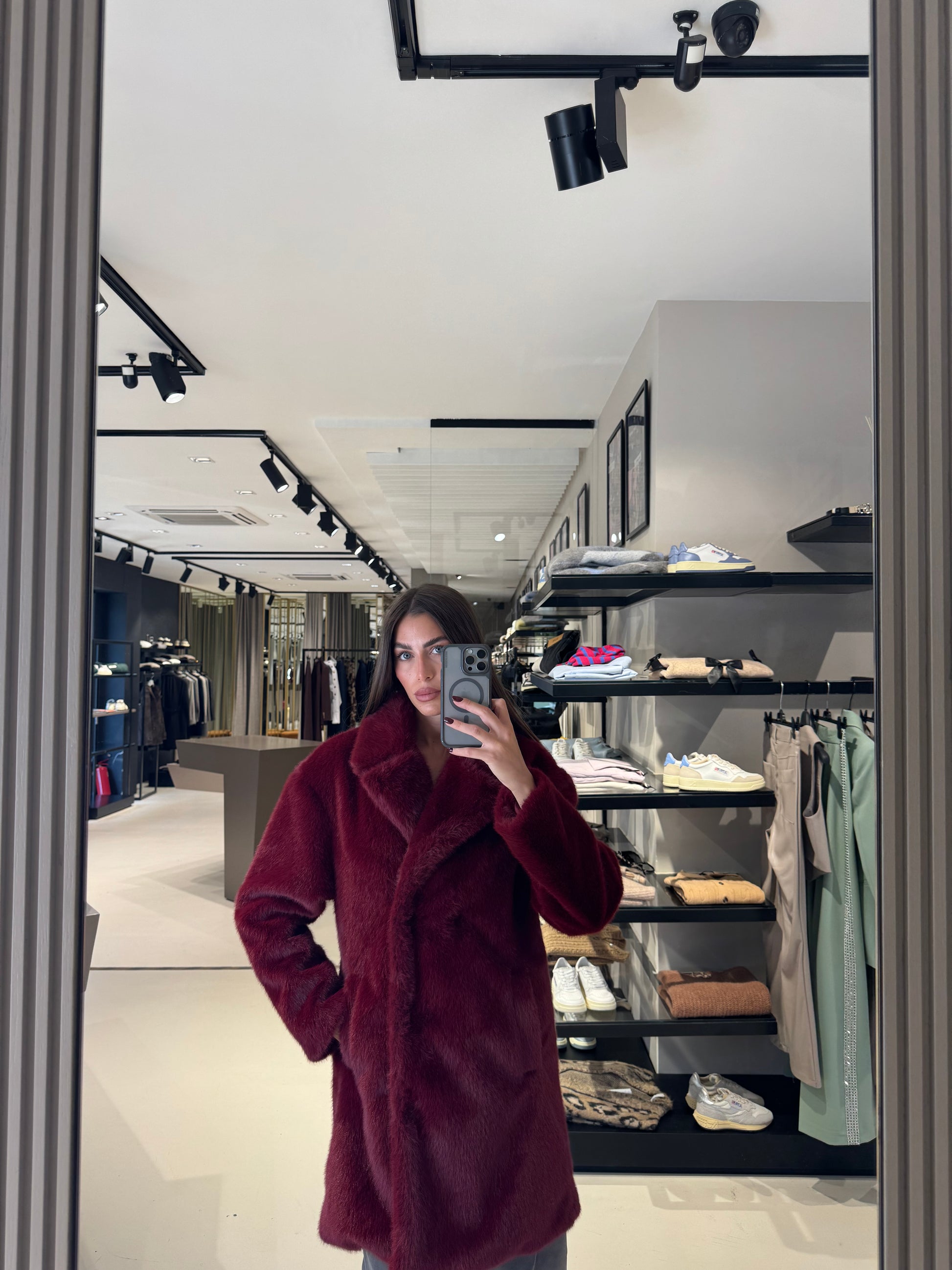 Cappotto effetto pelliccia dal taglio morbido e avvolgente. Il collo ampio e la chiusura doppiopetto donano un tocco sofisticato, mentre il tessuto effetto fur assicura calore e comfort nelle giornate più fredde. Perfetto per look casual chic o serate eleganti.