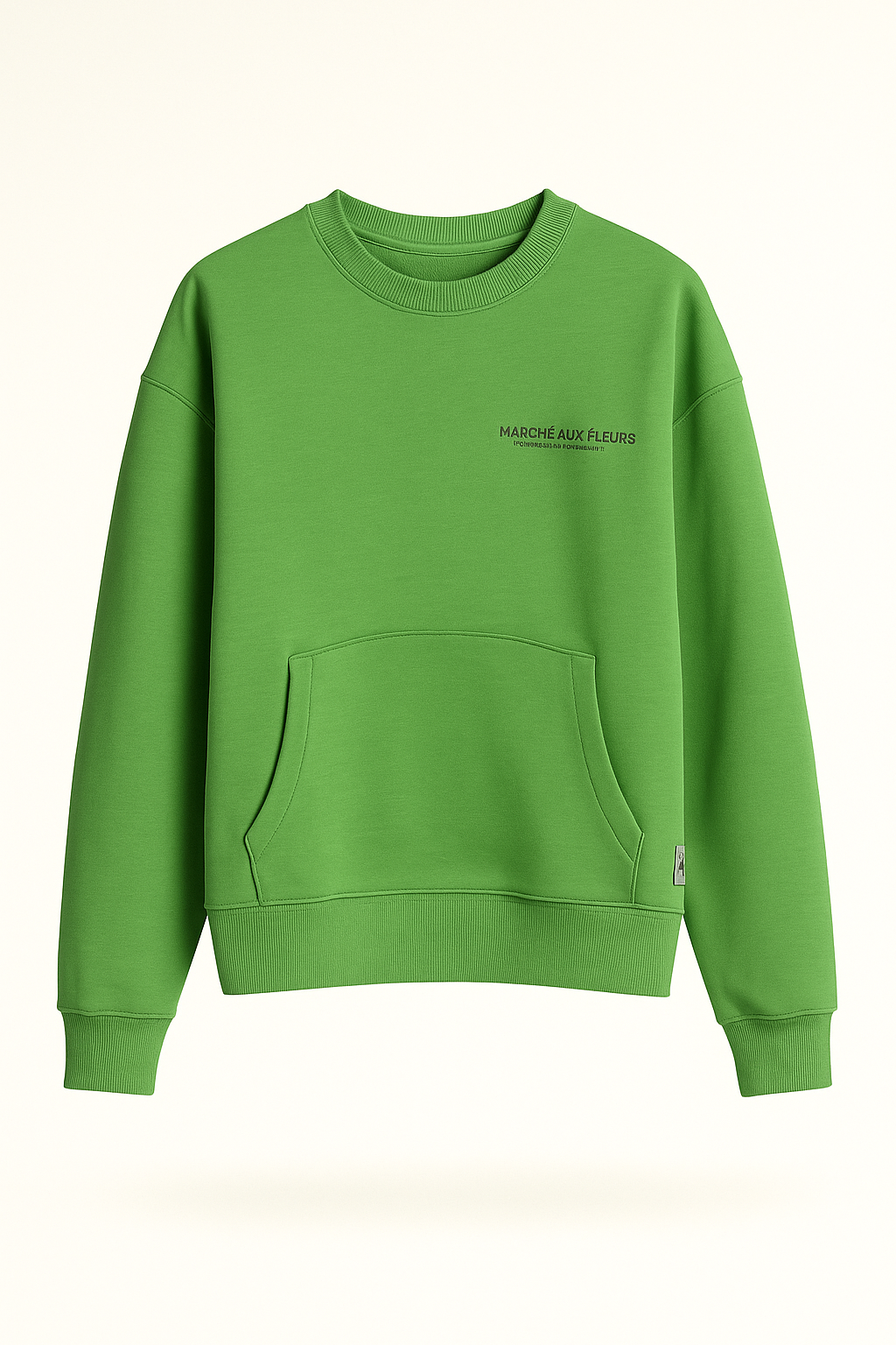 Felpa girocollo in cotone verde acceso con piccola stampa frontale “Marché Aux Fleurs”. Modello con tasca a marsupio e polsini, fondo e collo a costine. Vestibilità comoda, ideale per un look casual e contemporaneo.