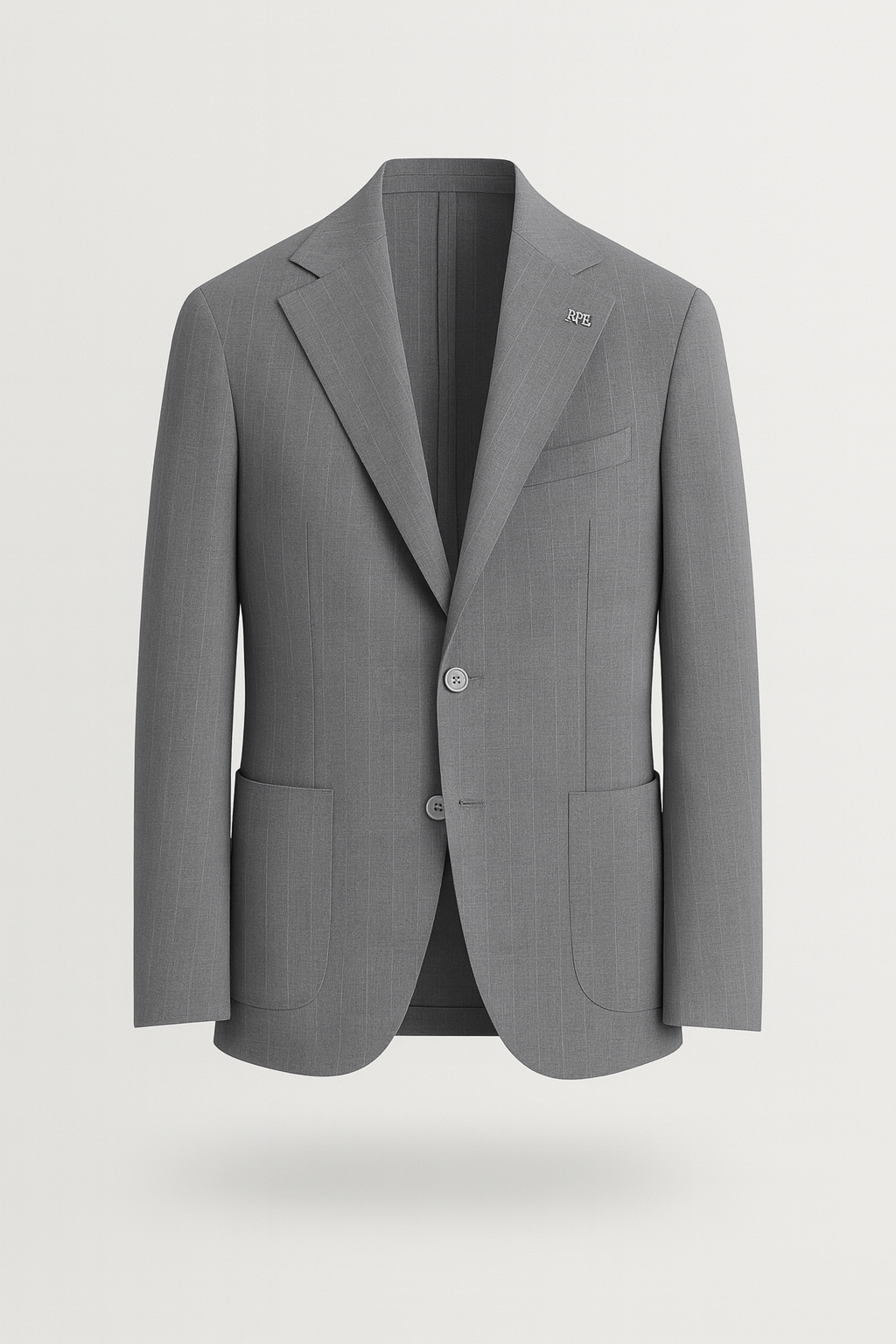 Giacca monopetto in lana grigia con taglio sartoriale e linee pulite. Revers classico, due bottoni e tasche frontali applicate. Struttura leggera e versatile, adatta ad outfit formali o casual raffinati.