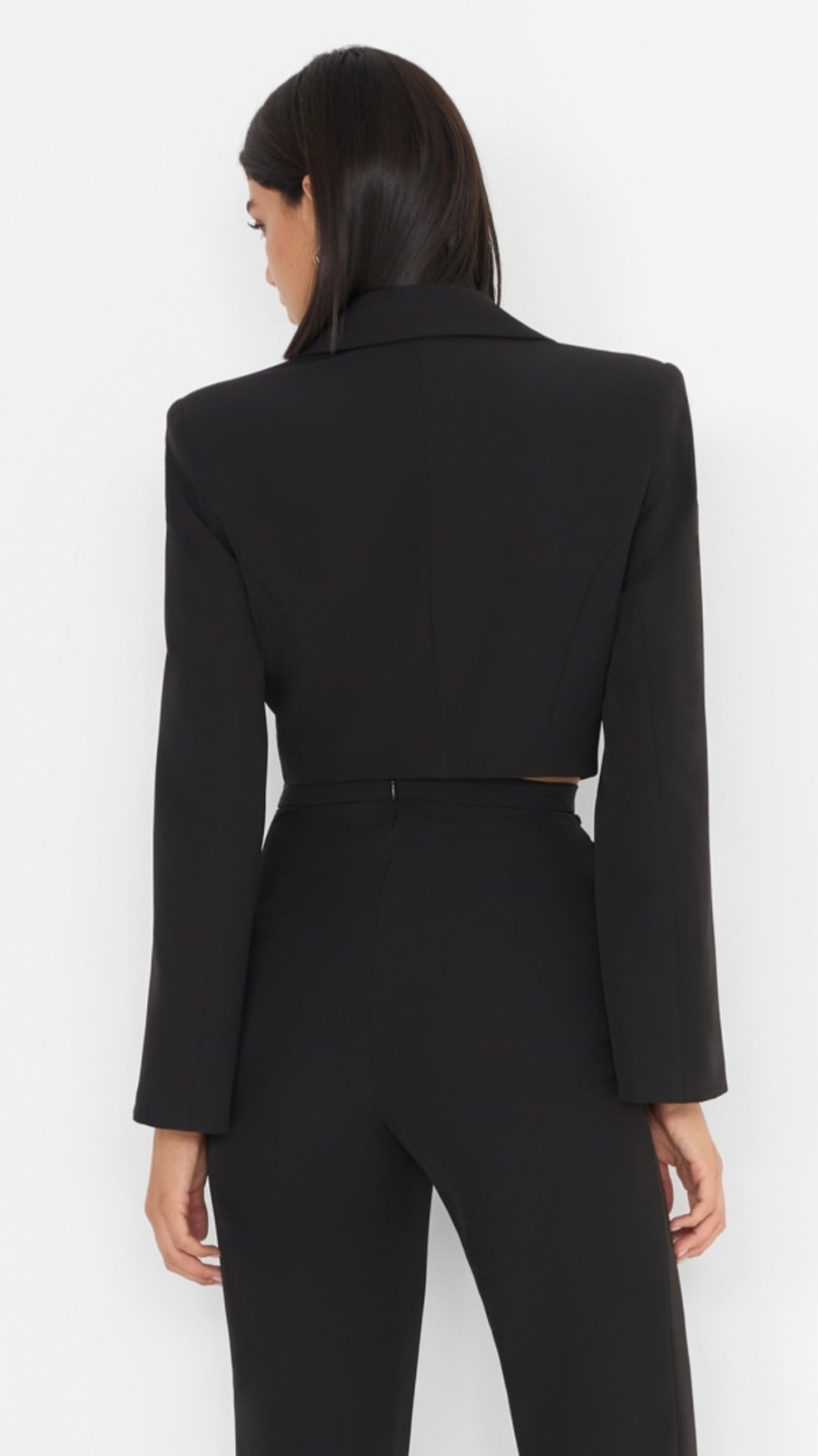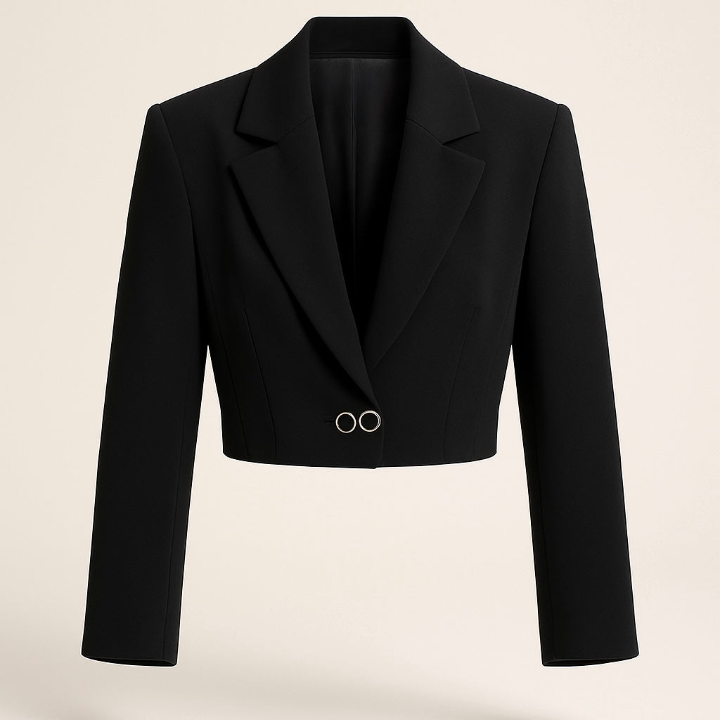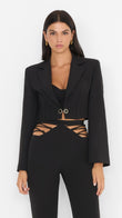 Blazer corto in tessuto nero, con linea pulita e moderna. Rever classico, chiusura con doppio gancio metallico frontale e spalle strutturate. Capo dal taglio sartoriale ideale per look eleganti o da sera.
