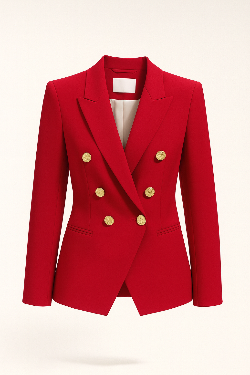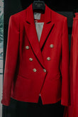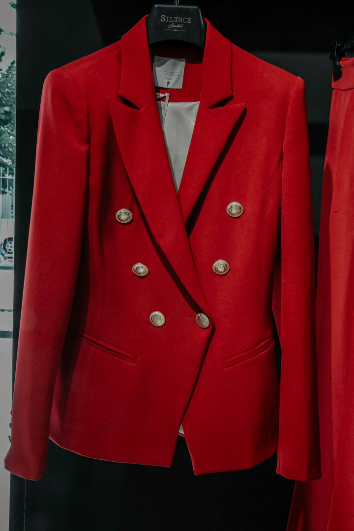 Blazer doppiopetto in tessuto rosso vivo, con bottoni dorati e linea sfiancata. Rever classico, tasche a filetto e spalle strutturate per un effetto elegante e deciso. Capo iconico dal fascino contemporaneo.