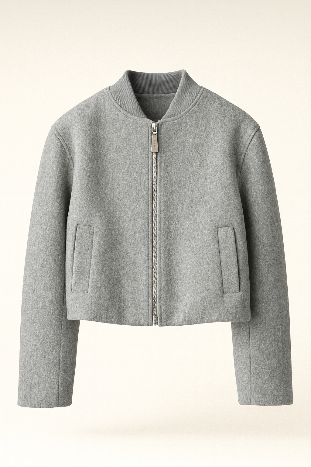 Giacca corta dal taglio pulito e contemporaneo, con zip frontale e collo in maglia. Realizzata in tessuto misto lana, offre calore e struttura mantenendo una linea essenziale. Tasche laterali inserite e polsini puliti per un look minimal ed elegante.