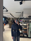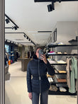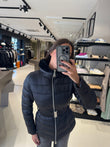 Piumino da donna in colore nero, elegante e avvolgente. Realizzato in tessuto tecnico trapuntato con imbottitura calda e leggera. Presenta cappuccio bordato in ecopelliccia, cintura elastica con fibbia metallica per valorizzare il punto vita e chiusura frontale con zip. Le tasche laterali con cerniera completano il design pratico e raffinato.