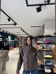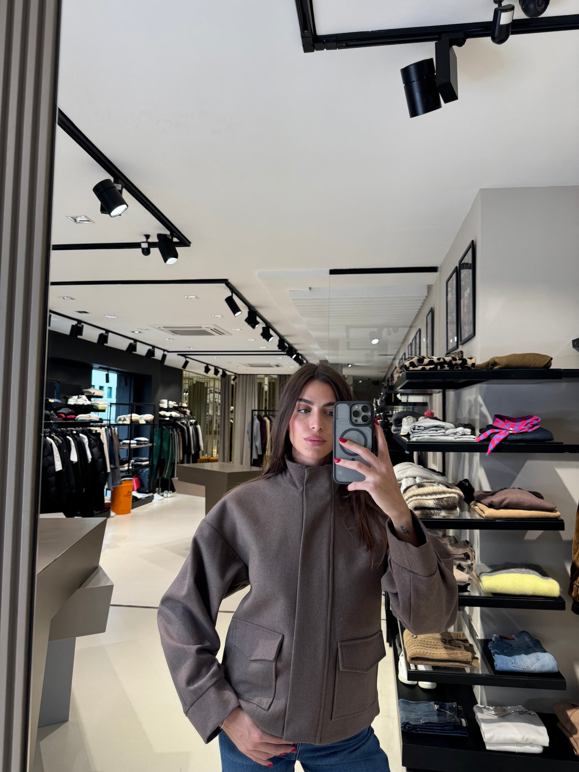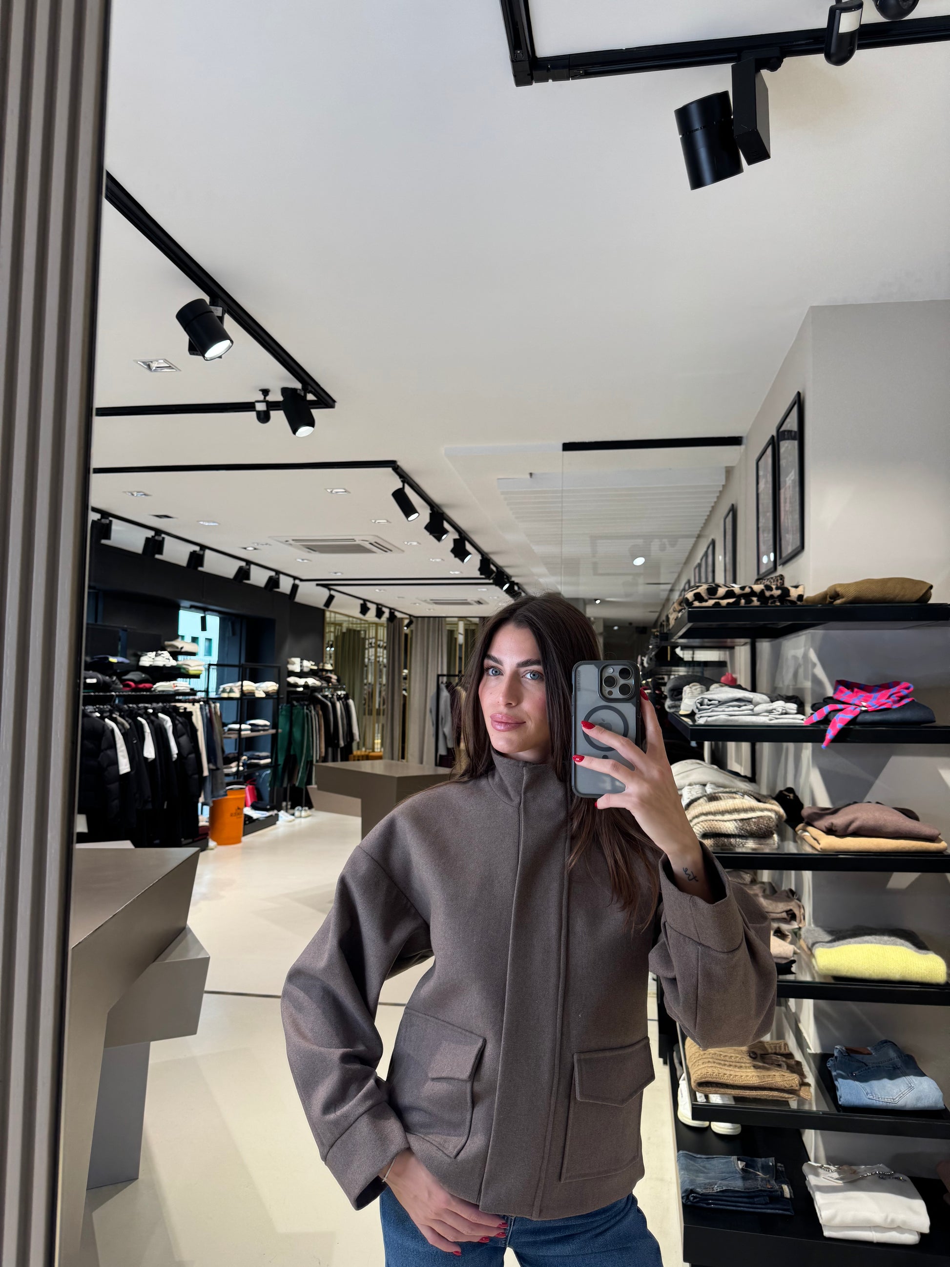 Giaccone da donna in colore tortora scuro, realizzato in morbida lana misto cashmere. Presenta collo alto strutturato, chiusura frontale coperta con zip e automatici, tasche con pattina e linea leggermente svasata. Un modello elegante e moderno, perfetto per un look sofisticato nelle giornate più fredde.