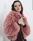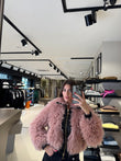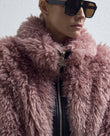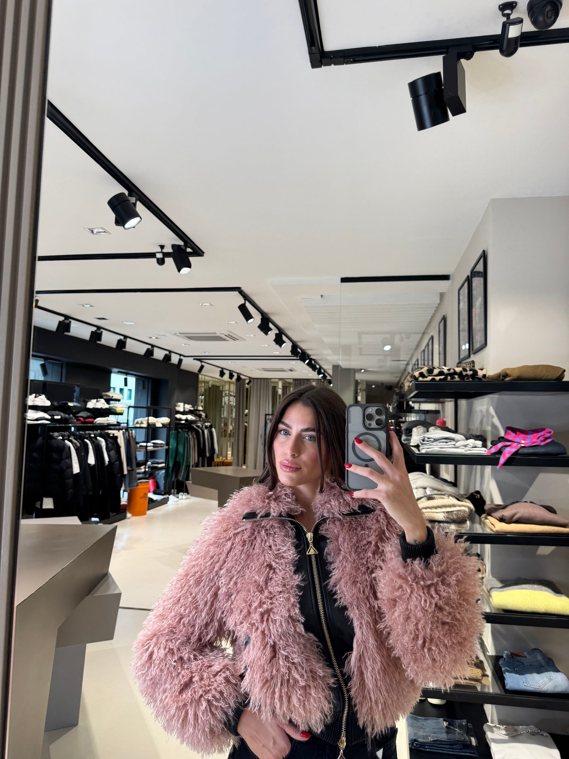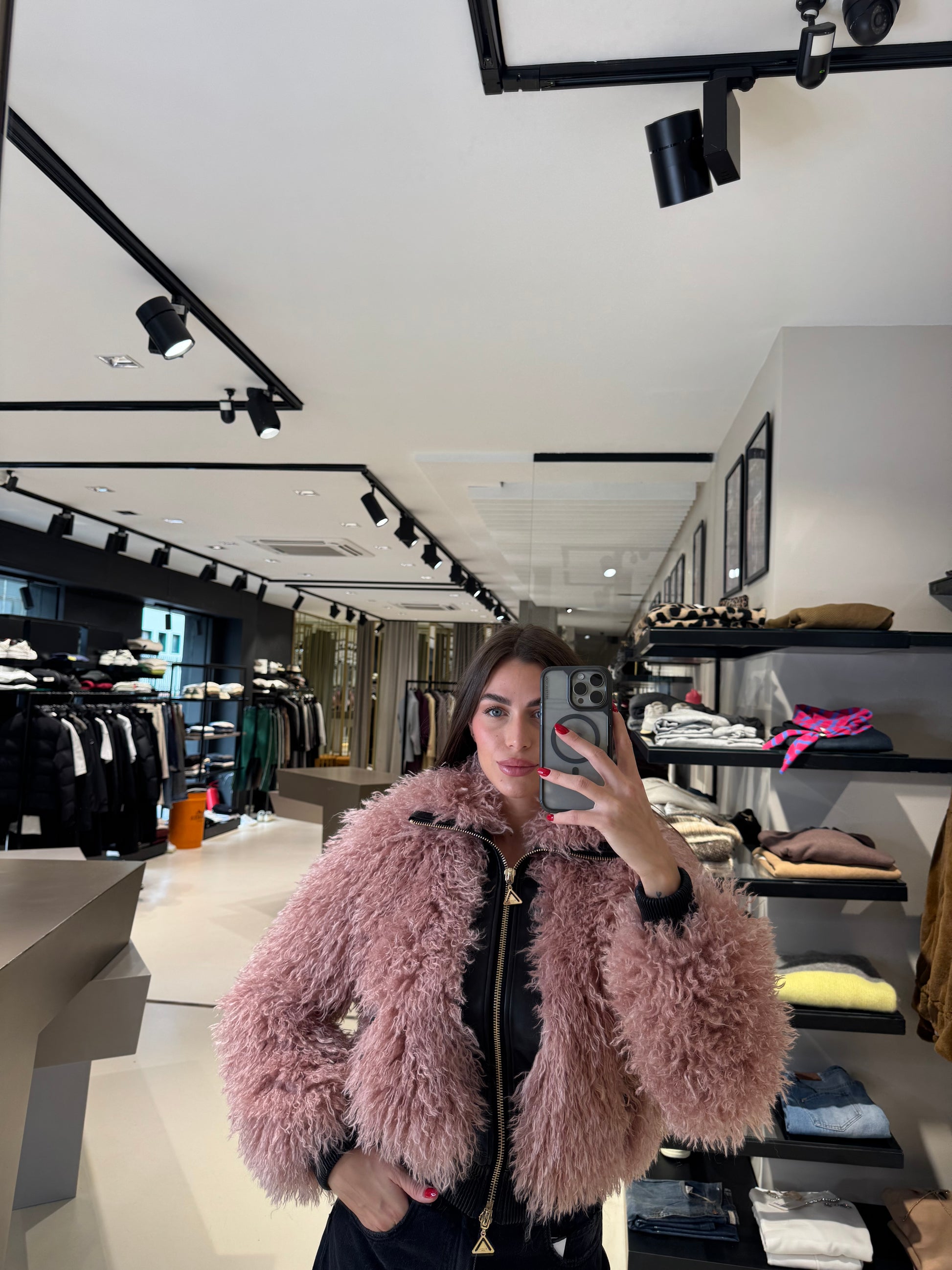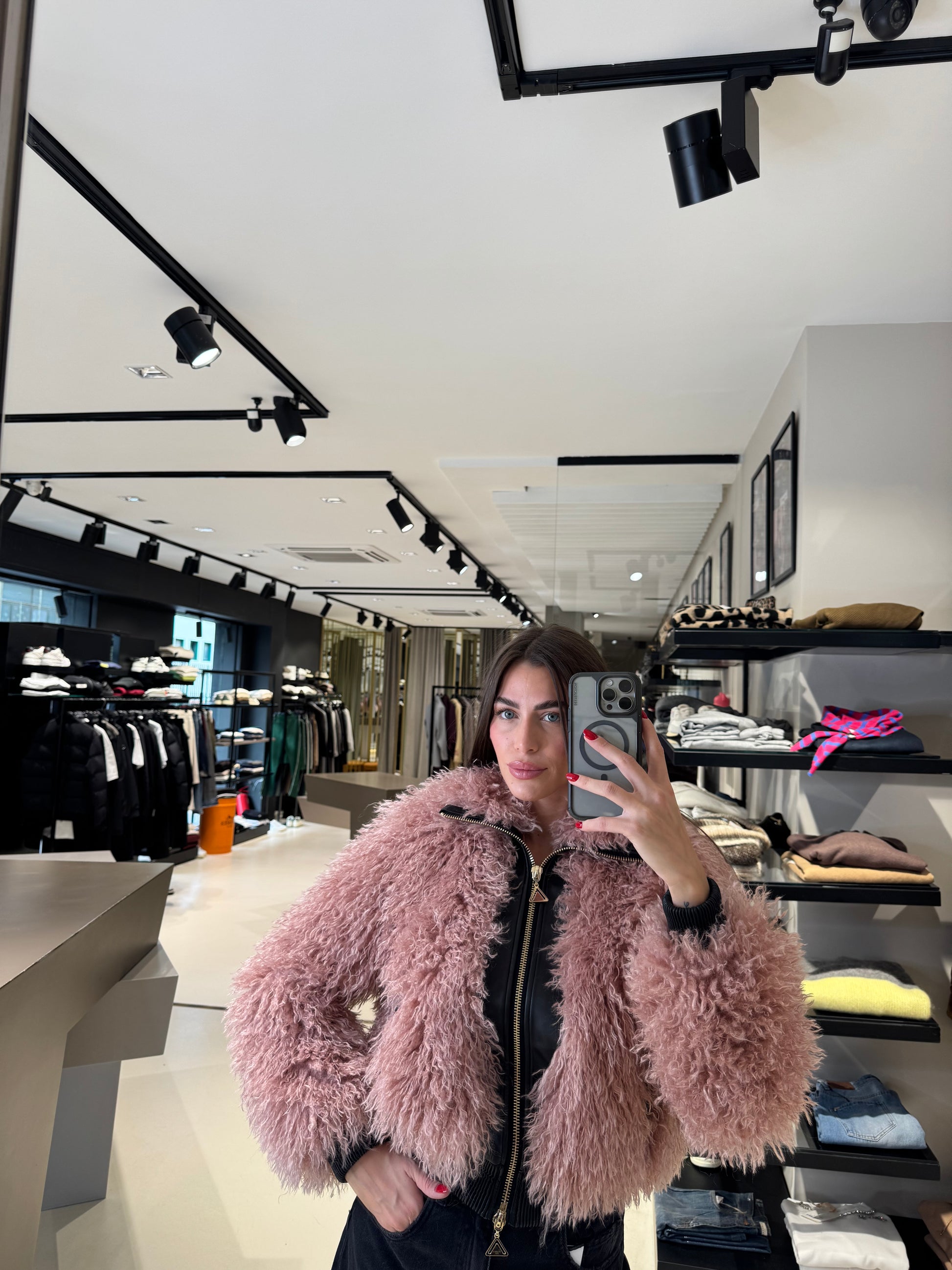 Giacca corta in ecopelliccia lunga effetto mongolia, con chiusura frontale a zip metallica e dettagli in ecopelle nera sul fondo. Collo ampio e struttura voluminosa per un look glamour e deciso. Morbida al tatto e perfetta per outfit serali o streetwear sofisticati.
