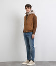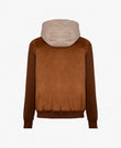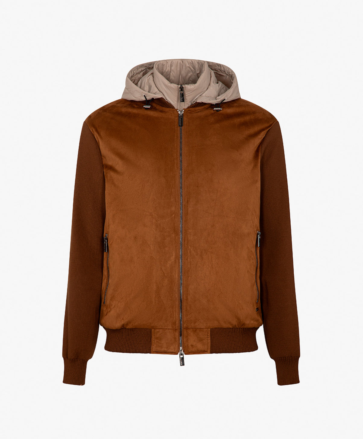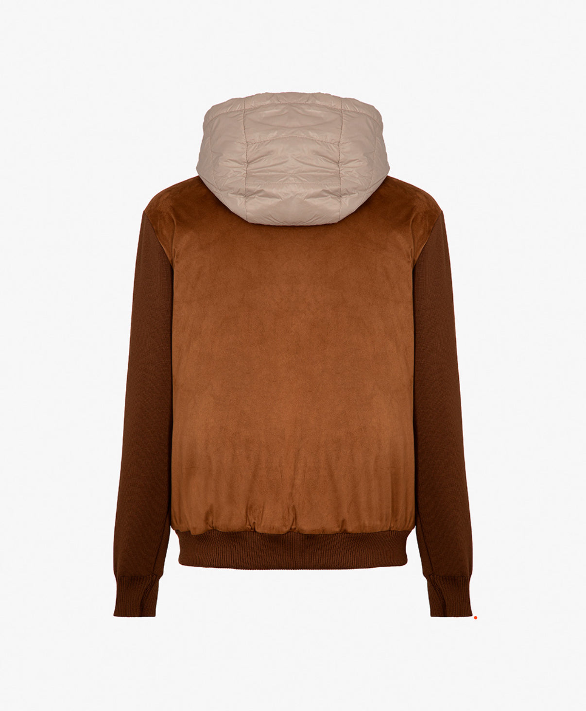 Bomber in colore cammello, realizzato con corpo in eco-suede e maniche in maglia. Il cappuccio imbottito in nylon trapuntato aggiunge un tocco tecnico e contemporaneo. Tasche laterali con zip e fondo in maglia elasticizzata per una vestibilità confortevole.