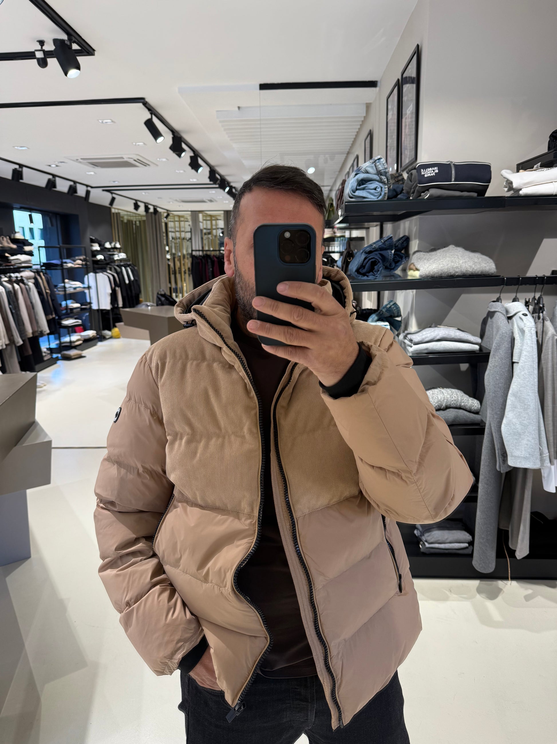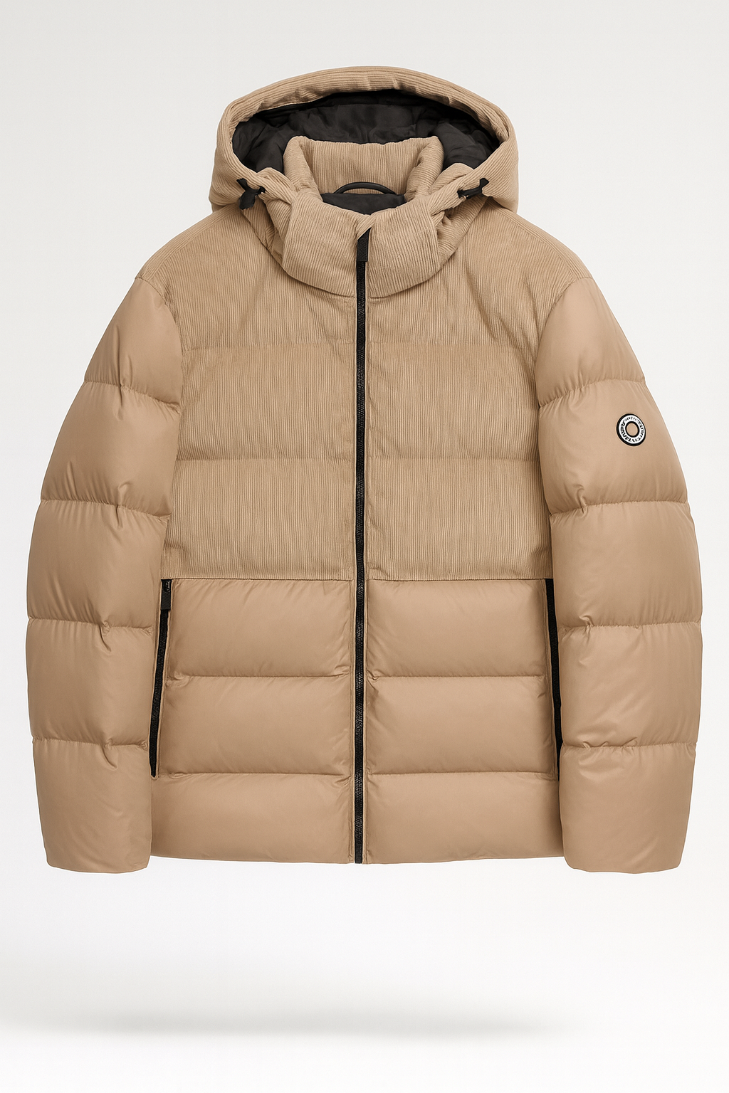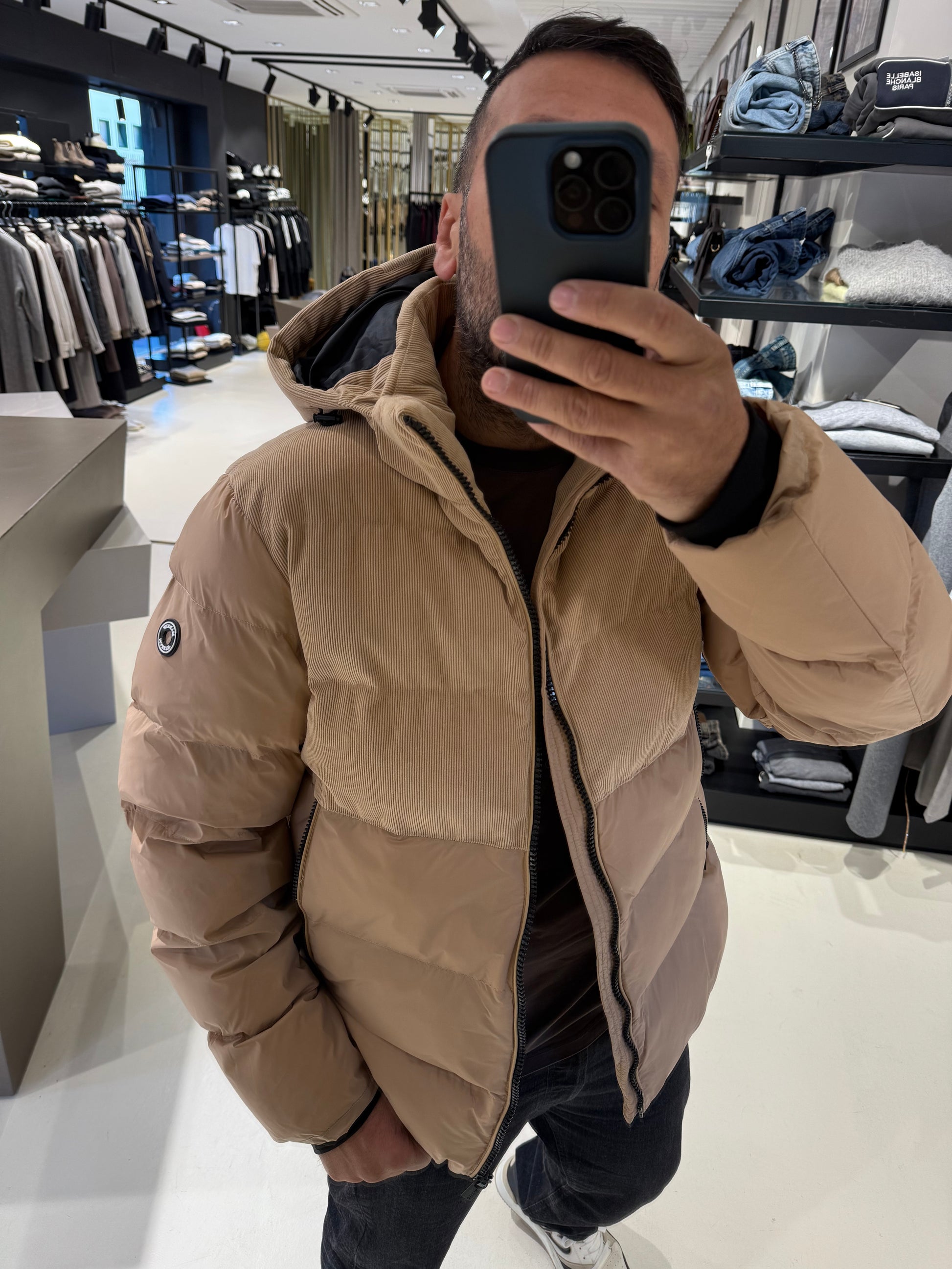 Piumino imbottito con parte superiore in velluto a coste e corpo liscio effetto opaco. Dotato di cappuccio regolabile, chiusura con zip a contrasto e tasche laterali con zip invisibili. Unisce comfort e stile con un design moderno e dettagli ricercati.