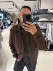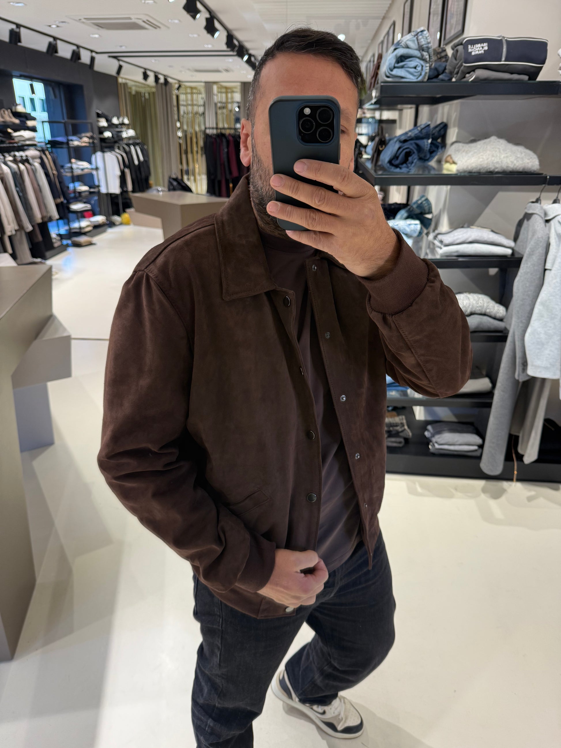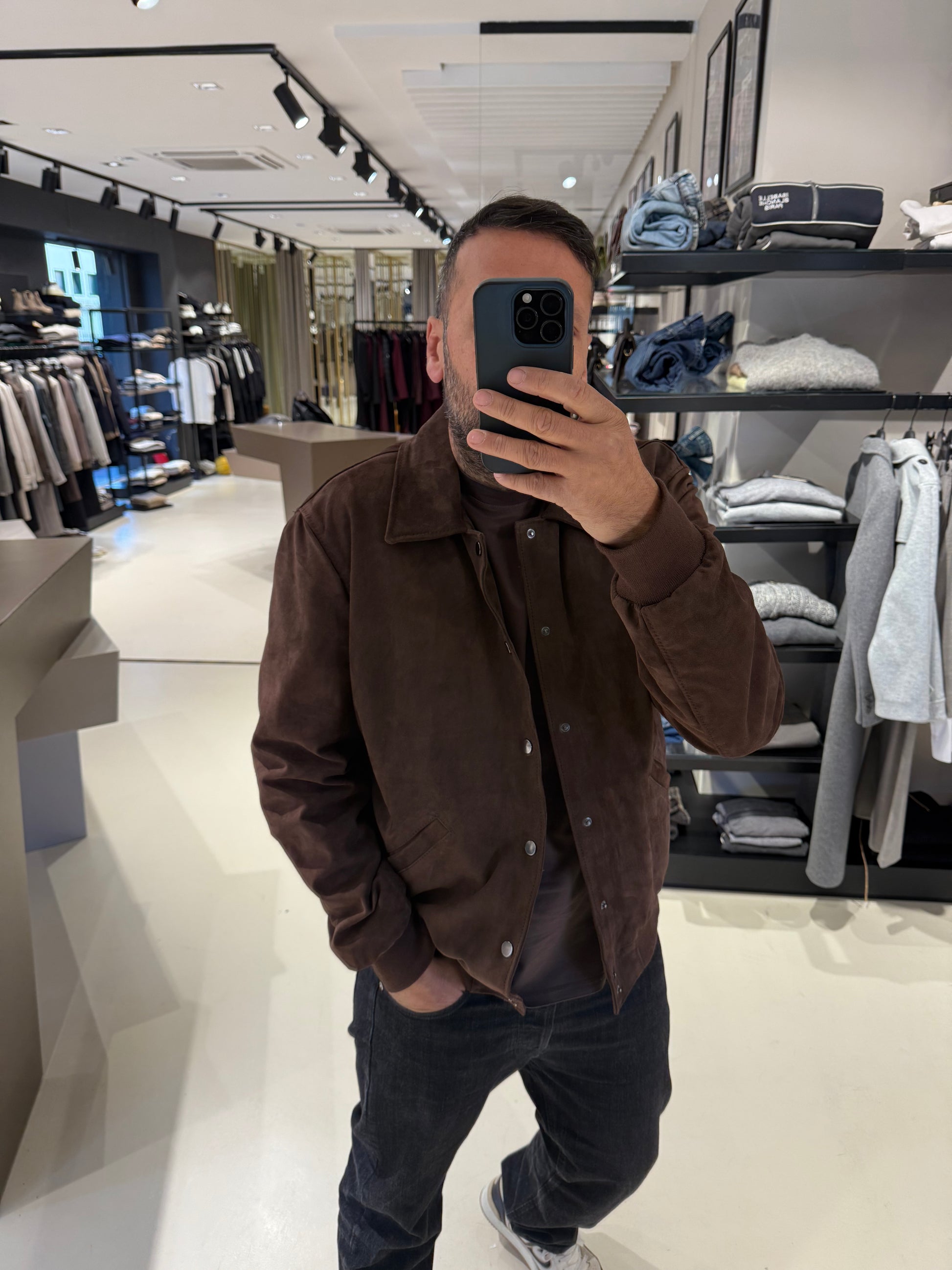 Giacca in pelle scamosciata marrone, modello bomber con collo classico e chiusura a bottoni automatici. Tasche laterali inclinate e fondo in maglia elasticizzata per una vestibilità confortevole. Capo raffinato e versatile, ideale per look casual chic.