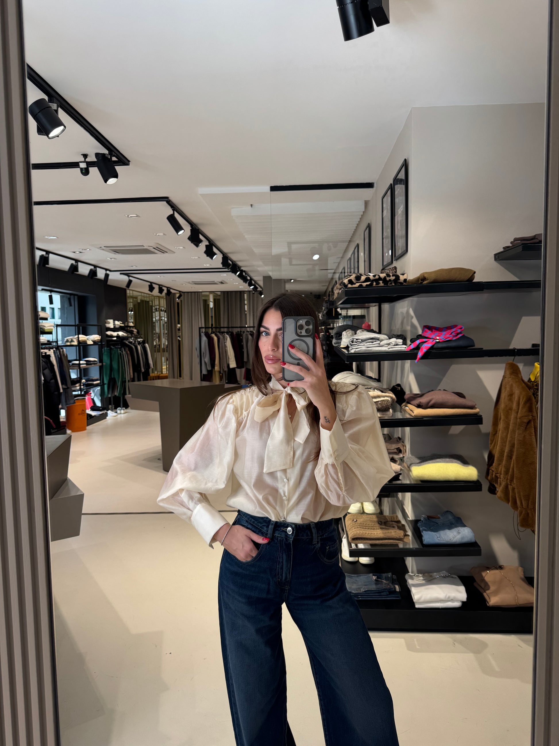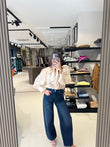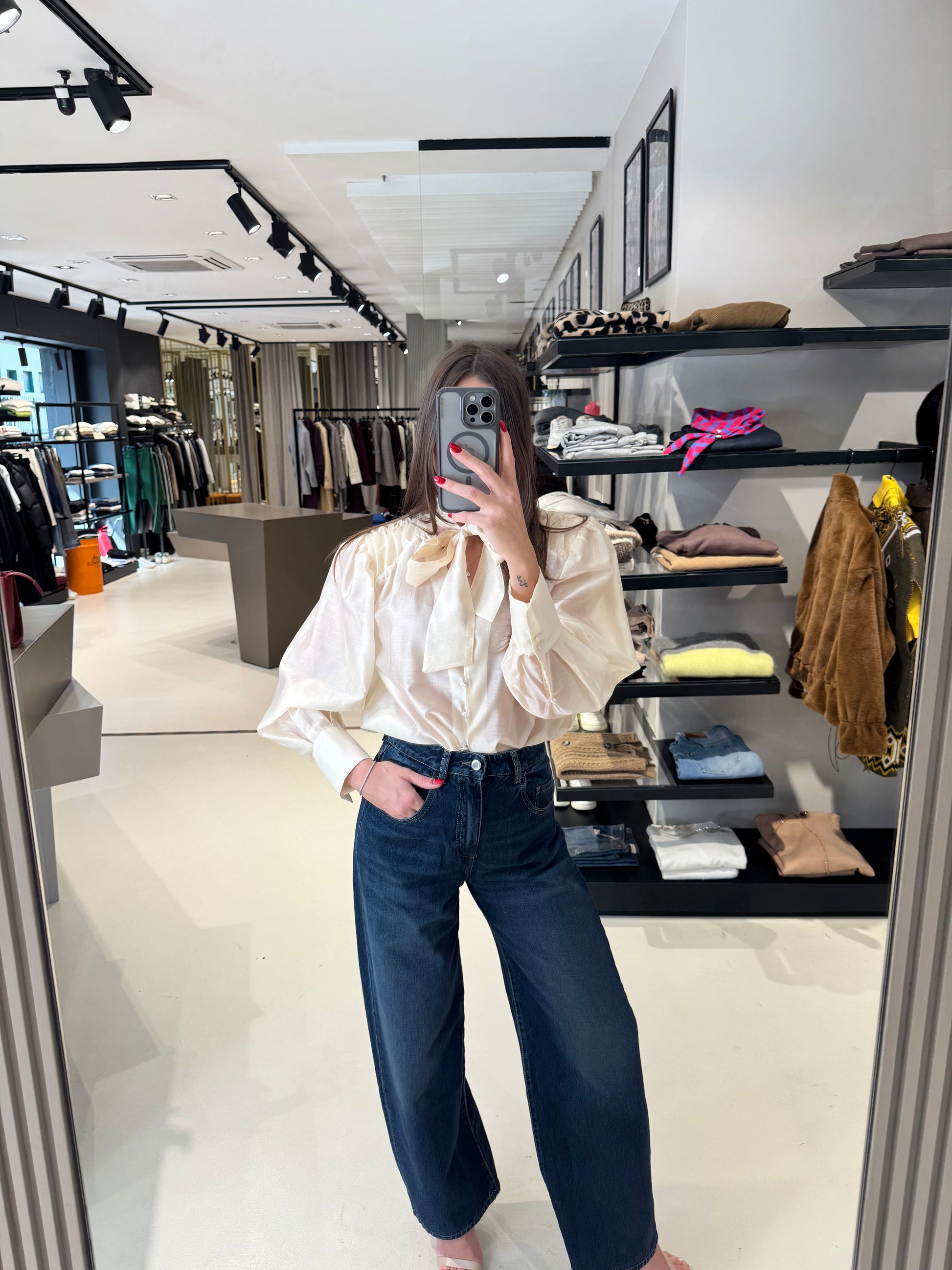 Jeans in denim blu scuro con effetto sfumato e lavaggio leggermente vissuto. Modello wide leg a vita alta, cinque tasche e chiusura frontale con bottone e zip. Look moderno e versatile, perfetto con sneakers o tacchi.