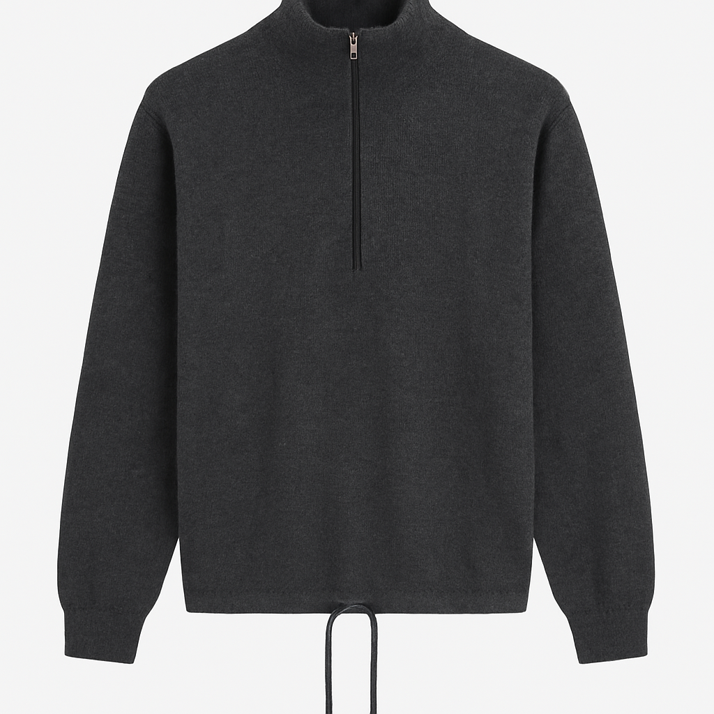 maglione grigio scuro mezza zip in stile minimal e moderno. Ha collo alto con zip centrale, fondo regolabile con coulisse e maniche semplici. Un capo versatile e pulito, ideale per uno stile casual chic o per un look elegante abbinato a camicia e pantaloni sartoriali.