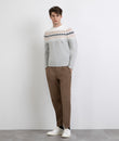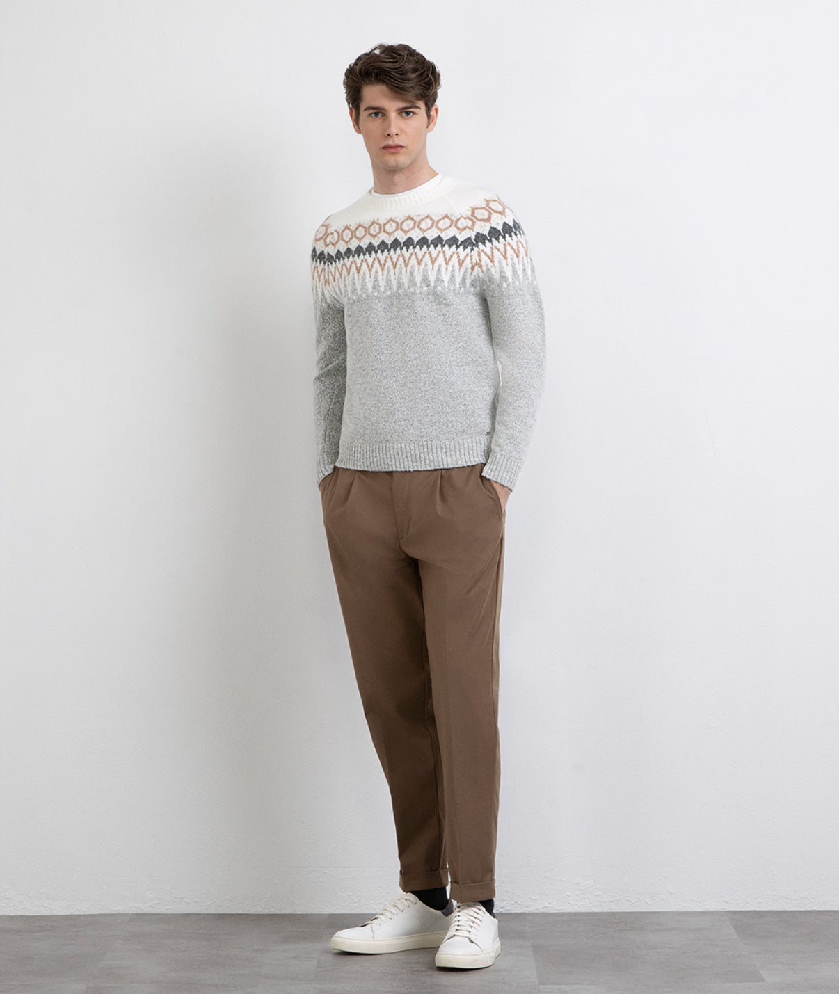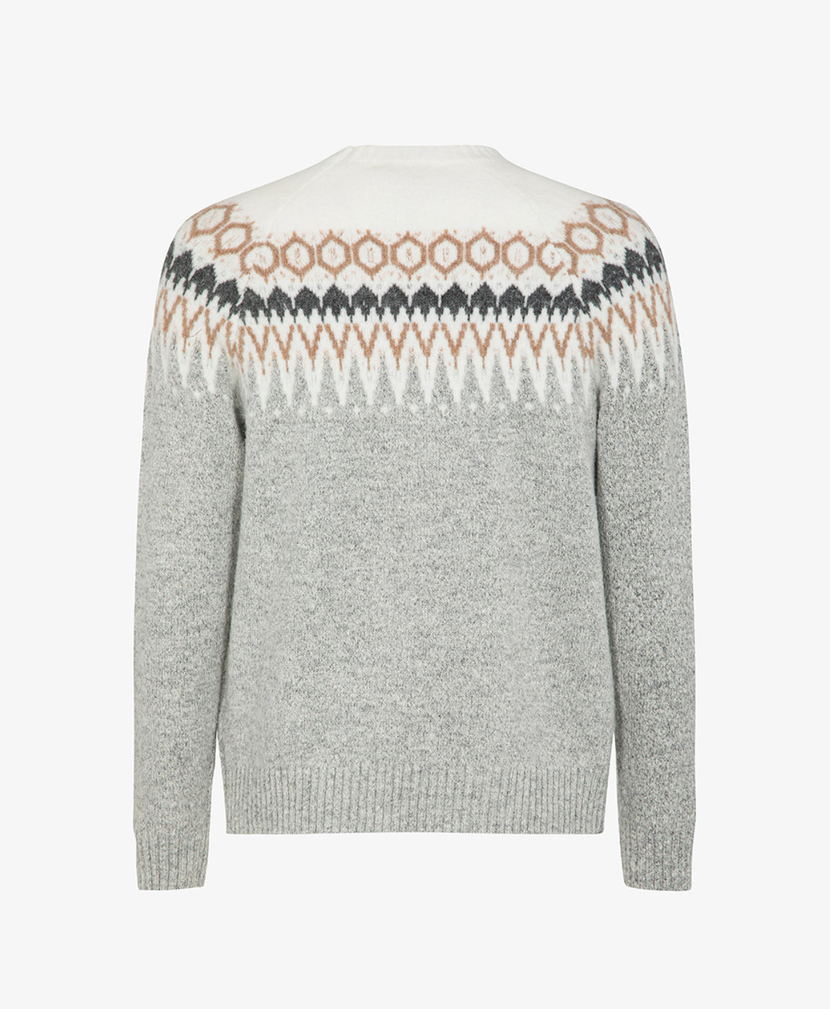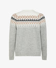 Maglione jacquard in misto lana grigio chiaro, con motivo geometrico multicolore su spalle e torace. Collo rotondo, maniche lunghe e bordi a costine. Morbido, caldo e dallo stile nordico, ideale per la stagione fredda.