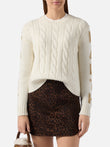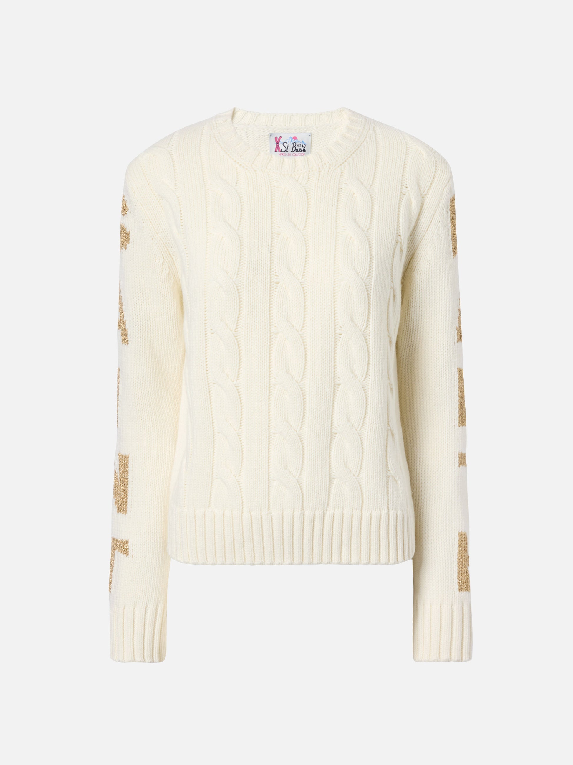 Malmo bianco mixa tradizione e logo-attitude: trecce morbide e maniche con jacquard St. Barth in lurex.