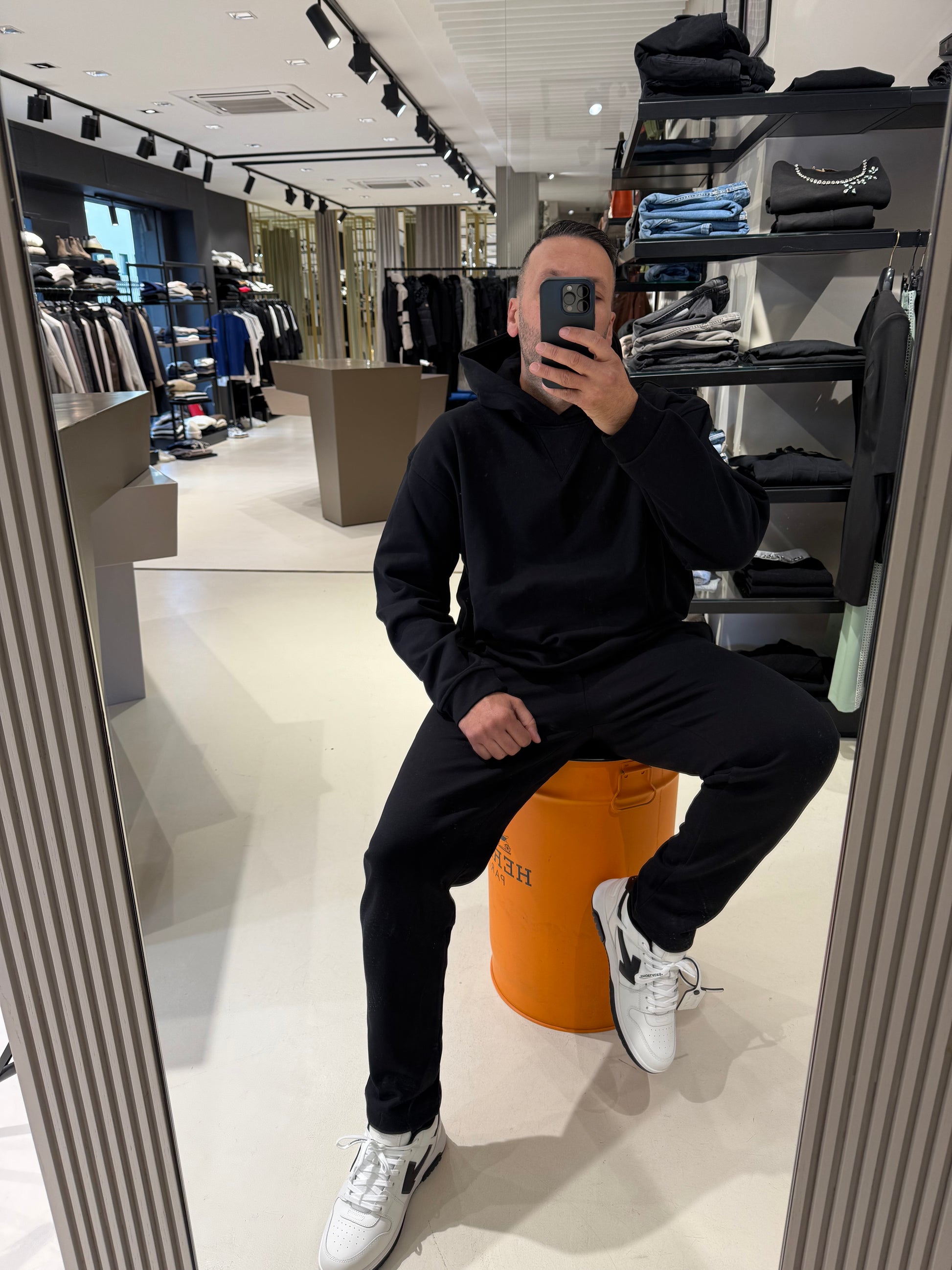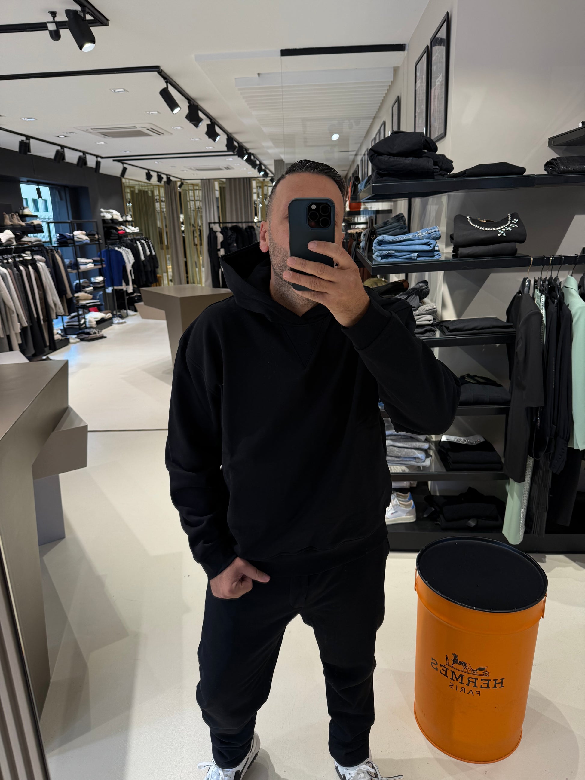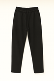Pantalone jogger nero in cotone elasticizzato, con vita elasticata e coulisse regolabile. Tasche laterali oblique e fondo dritto. Ideale per look casual e contemporanei.