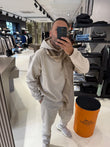 Pantalone jogger beige in cotone elasticizzato, con vita elasticata e coulisse regolabile. Tasche laterali oblique e fondo dritto. Ideale per look casual e contemporanei.